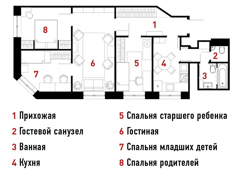 Заказчики Натальи Гусевой получили эту квартиру по наследству — их семья жила здесь, начиная с прадеда, а сам дом построили в 1904 году. В послереволюционные годы по итогам уплотнения здесь образовалась коммуналка, в 1950‑е годы случился капремонт, но, несмотря на все перипетии, старинная планировка не пострадала. Задача дизайнера состояла в том, чтобы сохранить здесь дух места, но при этом разместить на относительно небольшой площади семью с тремя детьми-подростками.