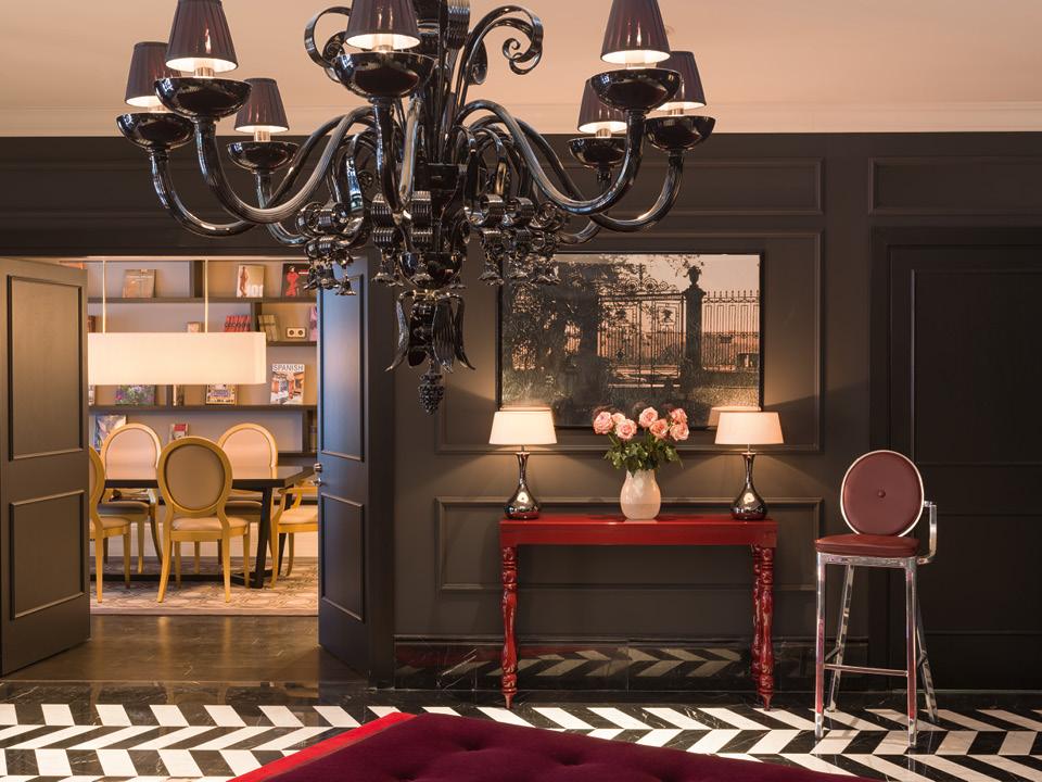 Проектировать интерьеры отеля Dom Boutique Hotel в особняке XIX века пригласили архитекторов из британского бюро Project Orange, которые привнесли в проект не только элементы английского стиля, но и английскую экстравагантность. Например, холлы и коридоры гостиницы выкрашены в черный цвет, а стены в ванных во всех шестидесяти номерах выложены блестящей черной плиткой. В гостинице есть свой бар, ресторан и библиотека при входе — с камином и работами петербургского фотографа Александра Китаева.