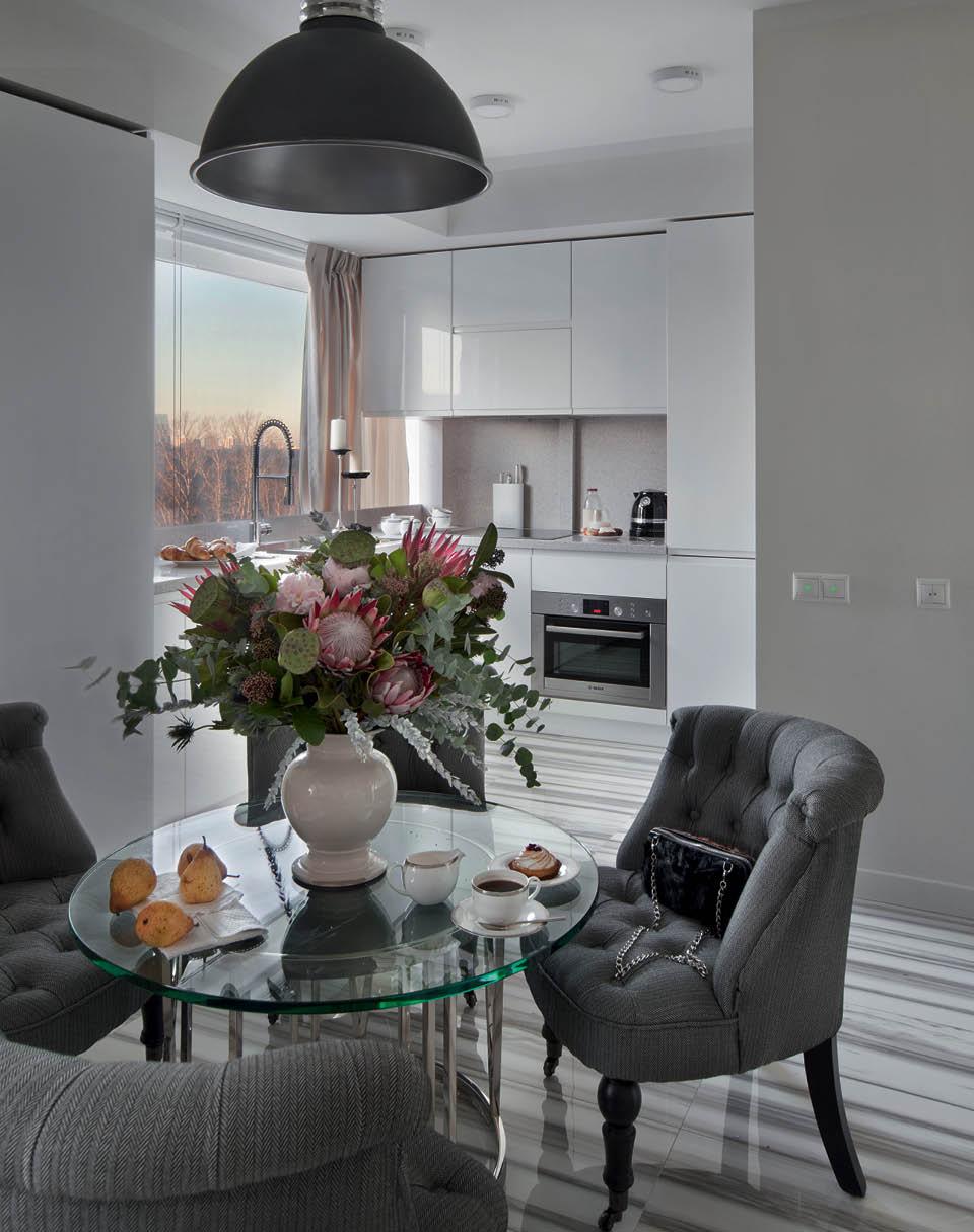 Подруги условились обойтись без сложных архитектурных решений — новая хозяйка хотела поскорее справить новоселье. Поэтому планировка почти не изменилась — Татьяна убрала межкомнатные перегородки, оставив кухню и ванную на прежних местах. Отделка тоже лаконичная — белая краска на стенах и пол везде из керамогранита. За счет единообразия интерьер выглядит цельно, и квартира кажется просторней. Но простота не отменяет интересных решений, благодаря которым пространство изменилось до неузнаваемости.