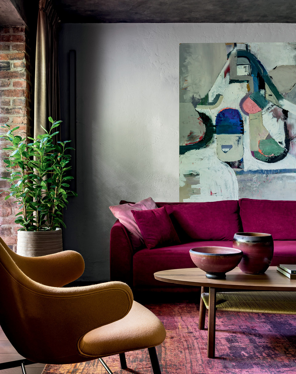 До прихода дизайнера заказчик уже успел сделать демонтаж и зачистить кирпич от штукатурки. Он планировал зашить его гипсокартоном и покрасить в светлый оттенок. Евгения предложила кардинально другой подход: обнажить старинную кирпичную кладку, покрыть ее лаком ради сохранности и защиты от пыли, а большую часть стен сделать черными. “Конечно же, заказчик боялся, но я привела ему пример с черной дырой, которая бесконечна, и именно черный цвет растворяет пространство”, — рассказывает Евгения. В прихожей и на кухне стены и потолок облицованы черными панелями с антивандальным покрытием, часть шкафов отделана зеркалами графитового оттенка, а в зоне гостиной потолок покрыт штукатуркой под бетон. Чтобы разбавить активную кирпичную кладку, в гостиной одна из стен грубо отделана штукатуркой и покрашена в сливочный цвет — на этом фоне очень эффектно выглядят вишневый диван и картина Яны Мазуркевич.