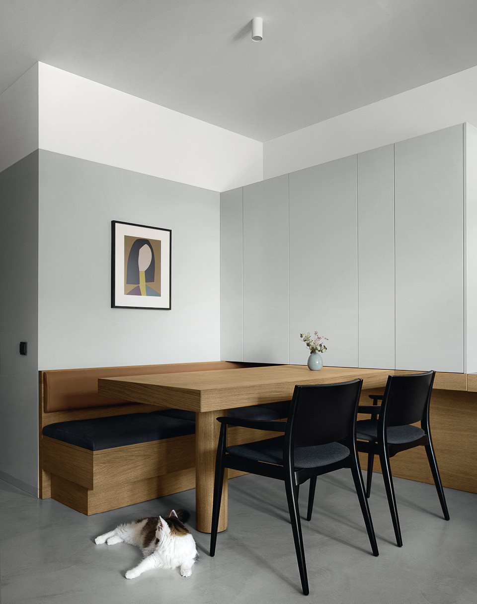 Несмотря на ограниченную площадь, дизайнер не мельчила: здесь просторная ванная, большая кровать и полноценный обеденный стол, с одной стороны от которого сконструирована лавка. “Крупные предметы дают ощущение масштаба. К тому же в этой квартире зона столовой выполняет роль гостиной, поэтому она должна была быть функциональной и удобной, а не декоративной”, — объясняет Евгения.