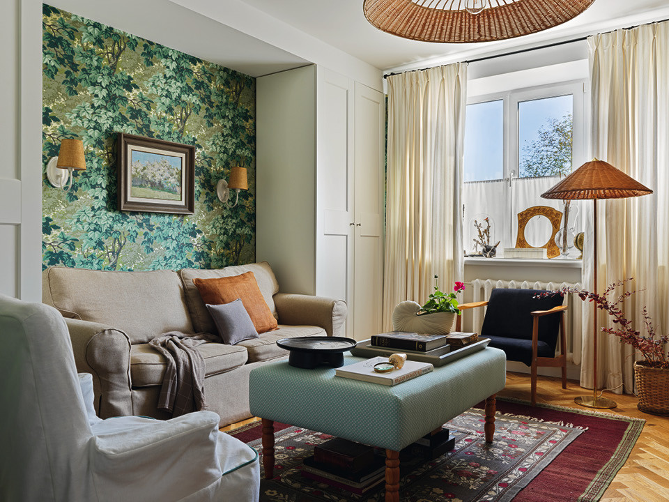 Квартира находится в двухэтажном доме, построенном когда-то для работников старого аэропорта. Это довольно скромное жилье с невысокими потолками, зато у квартир на вторых этажах есть отдельный вход. Ангелине это напомнило лондонские таунхаусы. В первый раз она оказалась здесь в разгар лета, и еще одним значимым впечатлением стало обилие зелени за окном. Именно так в гостиной появились обои с растительным рисунком, которые потянули за собой и цветовую гамму, и плетеные светильники, и живопись.