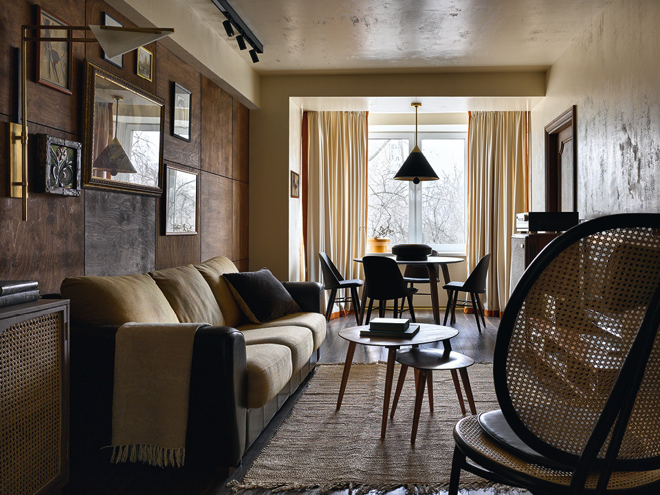 Одна из стен в этом пространстве отделана фанерными панелями, они напоминают о советских стенках, которые были в каждой квартире. Помимо эстетической у нее и функциональная составляющая: “Мне хотелось сделать такой фон, на котором можно в хаотичном порядке развешивать живопись, графику или гравюры — их у родителей очень много, и коллекция все время растет, — объясняет дизайнер. — Мы также добавили звукоизоляцию, чтобы не было слышно соседей”. А вот отец Арианы любит слушать музыку — напротив дивана стоят большие акустические колонки. Длину этой стены пришлось высчитывать по миллиметрам, чтобы вдоль нее уместилась вся необходимая аппаратура. В эркере разместилась обеденная группа. “Раньше он никак не использовался, тут был какой-то склад вещей”, — вспоминает Ариана Ахмад.