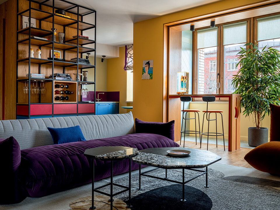 Хозяин квартиры по образованию японист, но по характеру отнюдь не минималист. Скорее бунтарь. Для Марии Амелиной это не стало сюрпризом — она давно знает маму заказчика, которая, как и ее сын, любит яркие цвета. Впрочем, цвет — еще не самое неожиданное, что есть в этом проекте.