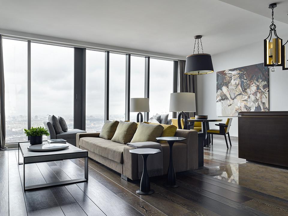 Панорамный предпоследний этаж скуратовского небоскреба, масштабное остекление гостиной и спальни с видами на юго-запад Москвы — было сразу понятно, что эта квартира должна быть оформлена роскошно, но не вычурно: дизайн должен был соответствовать видам, но не спорить с ними. Предназначалась она для молодой пары, которая много путешествует по миру, любит современное искусство и качественный дизайн.