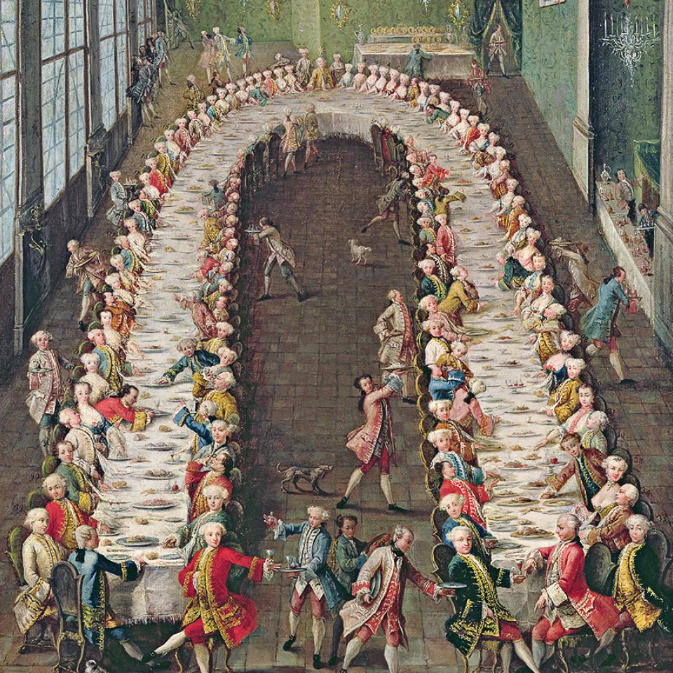 А раньше была французская подача, service à la française. Всюду: от Лиссабона до Петербурга, от Стокгольма до Палермо. Идея ее как будто бы проще пареной репы: все, что есть в печи, на стол мечи — все блюда выставляются на стол одновременно. Если обед по-настоящему большой и торжественный, то раблезианскую вереницу яств все-таки разбивали, словно высокопарную барочную оперу, на три “акта” — перемены. Супы и разнообразные закуски; жаркое, рыба, гарниры и опять-таки закуски; наконец фрукты и сладости. Принцип один: на столе должно быть тесно.