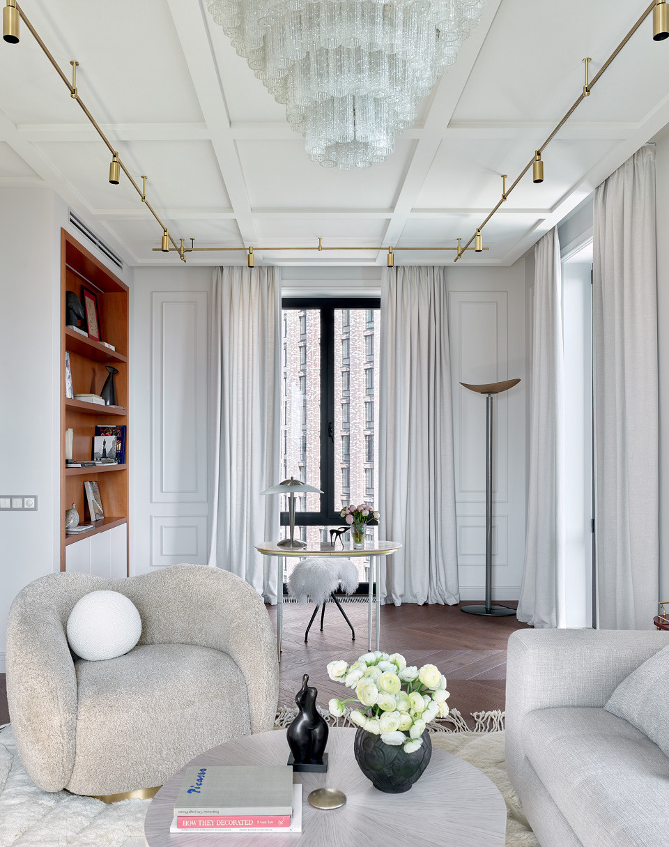 Квартиру в башне-новостройке заказчица Ольги Манаковой купила для дочери. Девушка выросла в загородном доме, оформленном в пышном классическом стиле, и мама опасалась, что в современной квартире ей будет неуютно. Однако архитектура дома и картинка за окном плохо вязались с резной мебелью, позолотой и прочими атрибутами классического интерьера, так что Ольга нашла компромисс: квартира оформлена в духе парижских апартаментов, где есть место и классическим деталям, и современному дизайну.