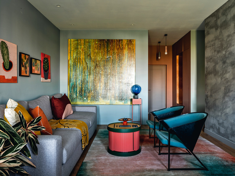 Сложная, с намеком на ретронастроение палитра этой квартиры, по словам дизайнера, выбиралась интуитивно — ни эскизов, ни мудбордов Юлия не делала. Дизайнер использовала любимые цвета, среди которых ей приятно находиться. По большей части сложные, играющие в зависимости от освещения. В спальне хозяйки цветной даже потолок — чтобы зрительно его приподнять. Сдержанной получилась только спальня сына-студента — молодой человек хотел интерьер построже. Здесь господствует серый цвет, а стена в изголовье отделана штукатуркой под бетон с имитацией следов опалубки.