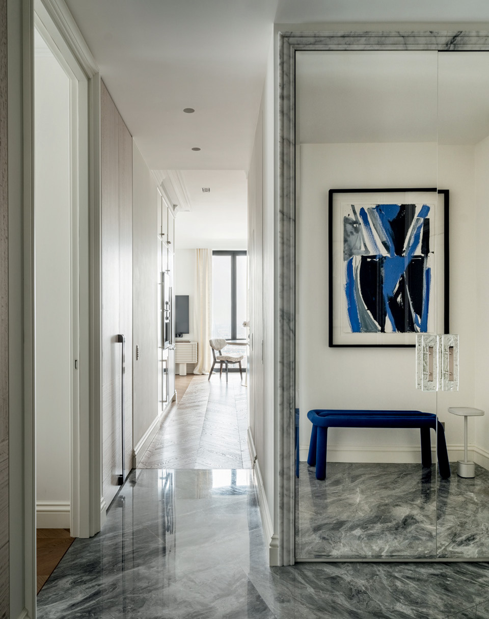 Дизайнер Ирина Граве работала над проектом для заказчиков в новом жилом комплексе в центре Москвы, и он ей так понравился, что она решила сюда переехать. Купила квартиру, из которой открывалась панорама города, сделала удобную для себя планировку, а вот над концепцией дизайна ей пришлось поломать голову. “Мне хотелось, чтобы интерьер отражал мою индивидуальность, стал моим лицом и моей визитной карточкой, — рассказывает Граве. — Также было важно сделать такой интерьер, в котором я могла бы отдыхать, проведя весь день в выборе мебели, цветов и отделки”. Она сделала ставку на спокойную классику — “французская елка” на полу, гипсовая лепнина, гладкие стены и обилие разных фактур.