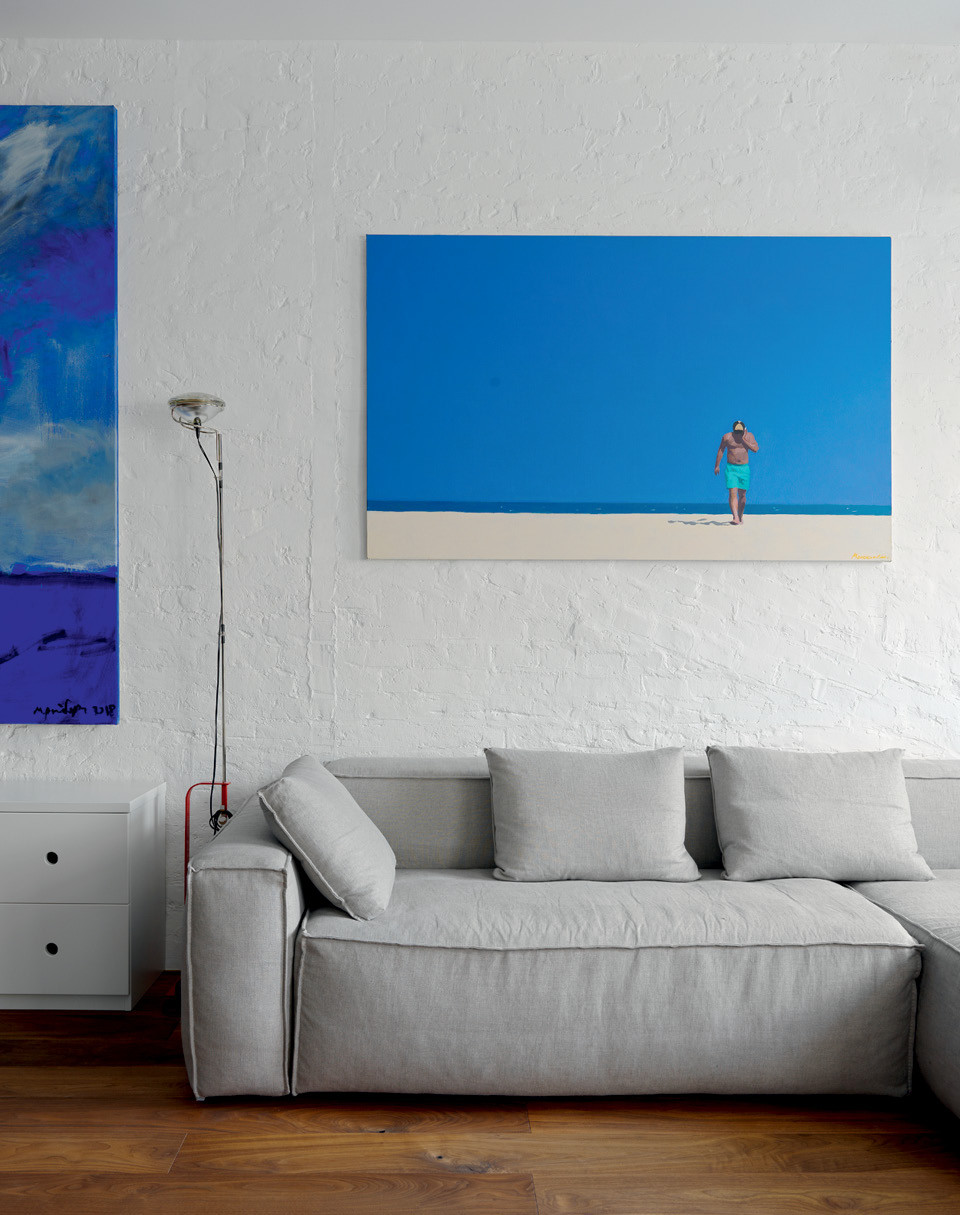 Мокрые зоны хозяева и архитектор решили не переносить: благодаря этому в квартире все еще чувствуется логика ее старой планировки. Напротив входа расположены две жилые комнаты, а коридор упирается в санузел, спрятанный в контрастный синий “куб”. Просторная общественная зона с открытой планировкой — единственное место, где пришлось снести перегородку. Это позволило увеличить площадь, объединить кухню с гостиной и наполнить комнату светом из двух больших окон.
