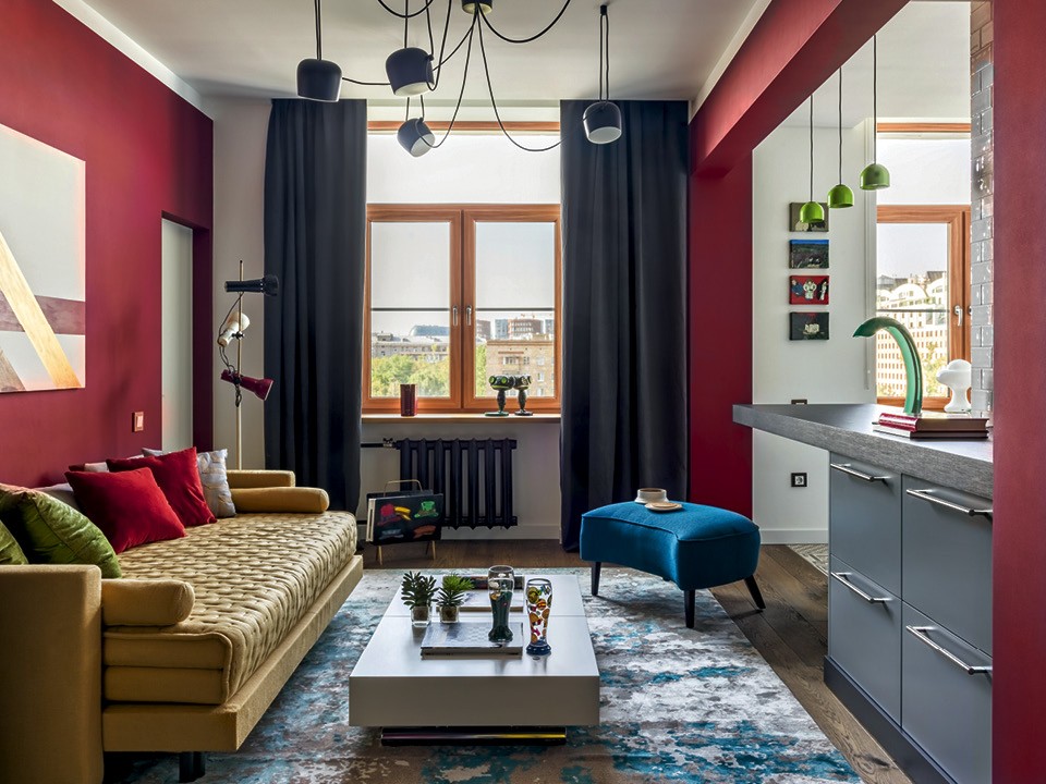 Команда Artechnology превратила стандартную московскую двушку в сталинском доме в эргономичное современное пространство. После перепланировки на месте коридора появились две гардеробные (одна в спальне, вторая в прихожей), а рядом с кухней — подсобка, куда убрали холодильник, стиральную машину и все необходимые в хозяйстве вещи. Прихожую, гостиную и кухню объединили, а спальню оставили изолированной. “Заказчица обращается к нам не в первый раз, — говорит Василий Почаев, один из архитекторов, работавших над проектом. — Обычно она принимает активное участие в оформлении, а в этот раз решила нам довериться. У нас не было никаких ограничений и строгого техзадания. Сначала мы планировали сделать простой интерьер в спокойной цветовой гамме, а потом добавили ярких красок, и хозяйке это понравилось”. Атмосферу уюта создали за счет текстиля (его подбирала клиентка). Зона гостиной отделяется от прихожей выдвижной перегородкой, которая доходит примерно до середины проема. Чтобы закрыть проход полностью, можно использовать плотную портьеру (такие же висят на окнах). Как это водится в небольших квартирах, вся корпусная мебель сделана на заказ и под размер. Так, кухонную барную стойку продлили в гостиную, где она превратилась в консоль с ящиками и открытыми полками.