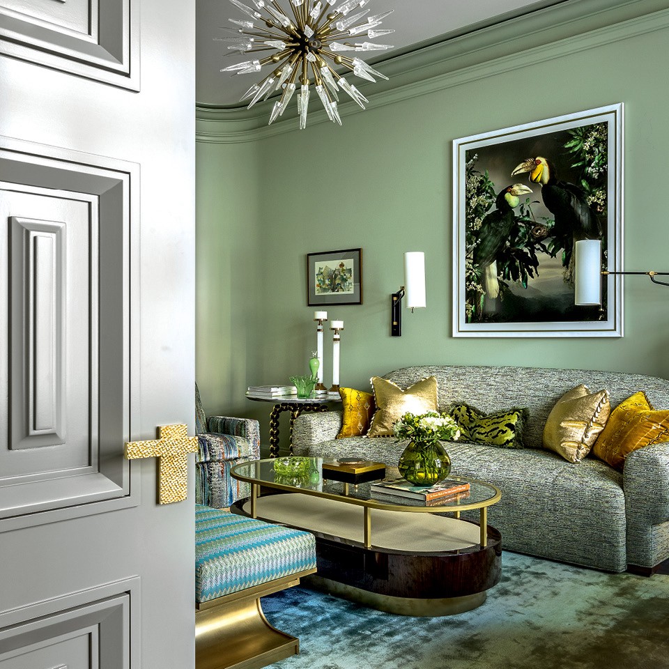 В дизайн интерьеров Борис пришел из мира моды. В каждом его проекте есть отсылки к известным фэшн-брендам и чувствуется любовь к цвету. Офис дизайн-студии не стал исключением. Прихожая выполнена в сероватом оттенке, разбавляют его золотые элементы в геометрии обоев и фурнитуре. Далее — роскошный синий коридор, который предвосхищает ожидания гостя. Продумывая раскладки для дверей гардеробной, Борис вспомнил о Dior Diorama: линии сумки можно рассмотреть на панелях, ее застежка стала прообразом для ручек шкафов.