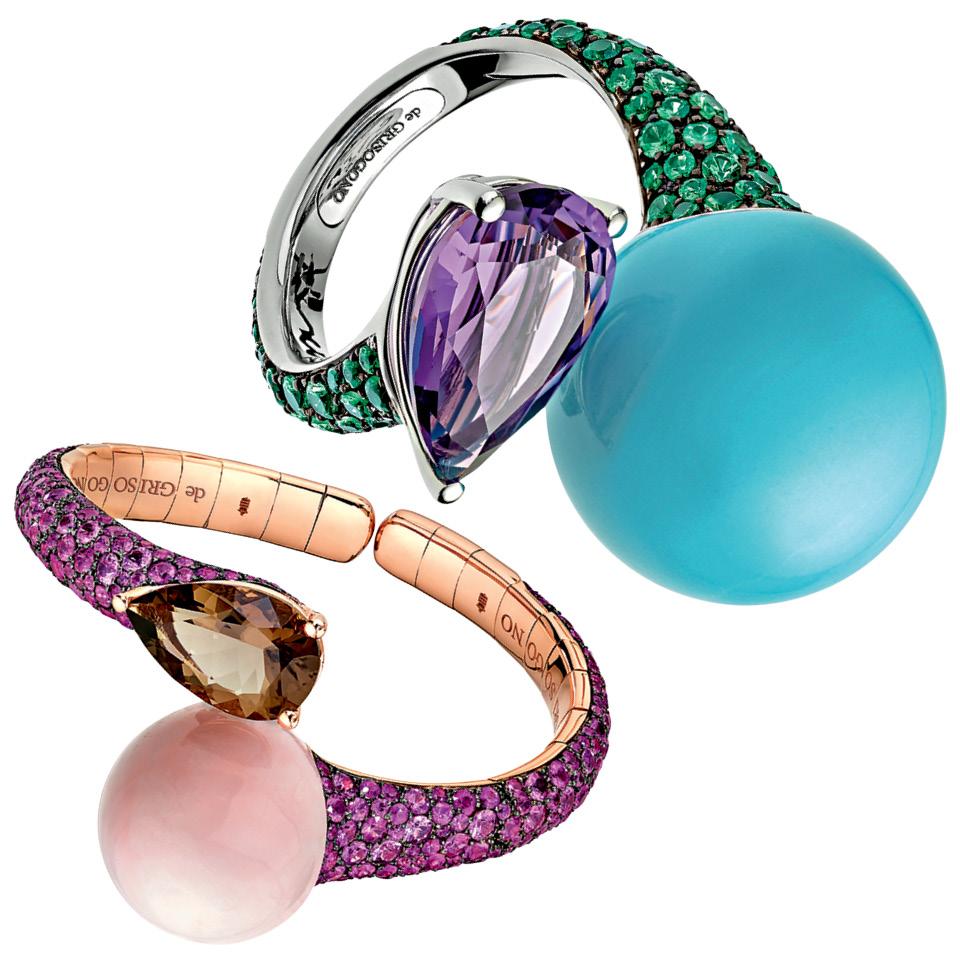Главной деталью украшений Boule стали шарики из непрозрачных полудрагоценных камней. На фото кольцо из белого золота, аметистов, цаворитов и бирюзы и браслет из розового золота, розовых опалов, дымчатого кварца и сапфиров цвета фуксии. Кроме них в коллекции, которую выпустила марка de Grisogono, есть серьги с аналогичным дизайном.