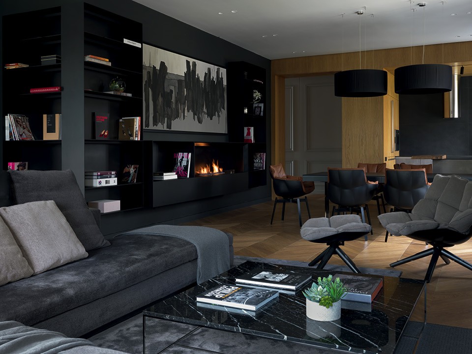 “Cперва мы купили квартиру в новом доме, потом в другом, а потом я случайно узнал, что знакомый продает квартиру на Патриарших. Зашел ее посмотреть, здесь было много маленьких комнат и очень своеобразный старый ремонт, но когда я вышел на этот балкон, увидел пересечение Большой и Малой Бронных, то понял, что хочу здесь жить. Стояла ранняя весна, и у меня возникло ощущение, что я нахожусь в центре Вселенной”, — начинает рассказ инвестбанкир Альберт Сагирян. Конечно же, они с женой Мариной купили эту квартиру и начали поиски дизайнера. Несколько специалистов не подошли, зато нашелся мастер Валерий Борзиков, который занялся демонтажом. “Это было непросто, — вспоминает Марина. — У предыдущих хозяев в ванной была дверка, за которой мы обнаружили комнату для флоатинга, звуко- и светонепроницаемую, эдакий бассейн с мягкими стенами. Не знаю как, но Валерию удалось его слить, не затопив все вокруг”. Он же посоветовал архитектора, который сделал удобную планировку, и она оказалась самой подходящей для семьи с двумя детьми, но визуальная часть оставалась нерешенной. “Мне очень хотелось, чтобы это были холодные серые и черные стены, минимализм без лишних деталей, хотелось ощущать объем пространства, чтобы в нем можно было дышать”, — вспоминает Альберт. Они с Мариной бесконечно листали инстаграм (соцсеть признана в РФ экстремистской и запрещена) и дизайн-порталы в поисках “того самого” дизайнера и нашли страничку YoDezeen. В проектах бюро превалируют темные оттенки и минимализм, но в этой квартире архитектор Артур Шарф предложил использов