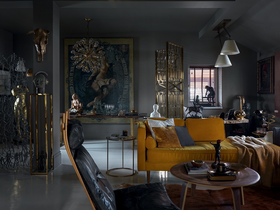 “За основу я взял традиционные вещи — белый потолок, деревянный пол, нейтральные или темные стены — и сделал “перевертыш”: то есть потолок у нас стал черным, дерево переехало на стены, а полы покрасили белой краской, причем я хотел, чтобы она растрескалась по швам”, — начал рассказ Александр Якимов, едва я успела переступить порог его дома.