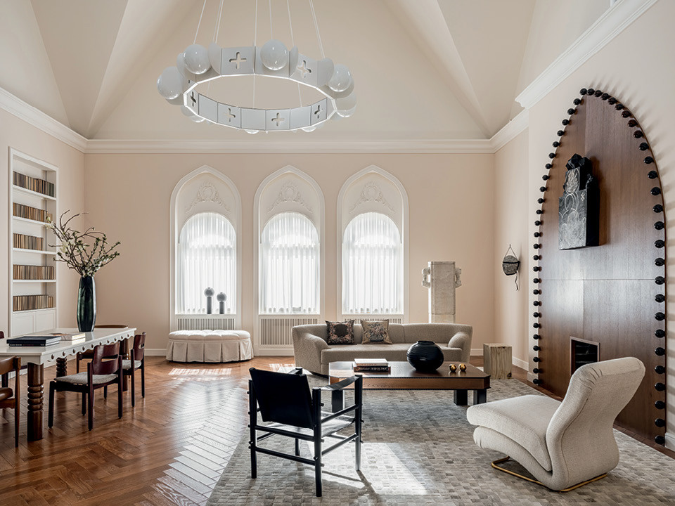 Питерская предпринимательница Мария Грудина приметила квартиру в башенке жилого комплекса “Русский дом” еще в процессе стройки. Оказалось, что она не первая положила на нее глаз. Но до сих пор все потенциальные покупатели “отваливались”, не понимая, как распорядиться помещением со сводчатыми потолками высотой восемь метров. А Мария квартиру купила, потому что знала, кто легко найдет ей правильное применение: Тимофей Вересновский, давний друг и дизайнер, с которым она уже сделала несколько проектов.