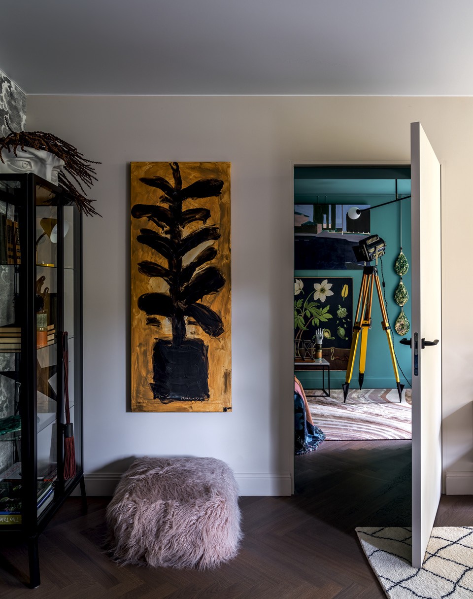 “Интерьер — это живой организм, в процессе стройки ты можешь увидеть то, что не видел на визуализациях, и придумать какие-то дополнительные фишки”, — начинает рассказ дизайнер Илья Гульянц. Свою московскую квартиру он видел спокойной и светлой, чтобы можно было наполнять пространство искусством и менять его по настроению. Но внезапно случилась поездка в Марокко, которая вдохновила дизайнера на яркие цвета в своем доме. Так ванная стала терракотовой, а спальня сине-зеленой. Илья говорит: “Я называю ее не спальней, а пространством для сна, поэтому стены и потолок здесь одного цвета. Это создает обволакивающую и спокойную атмосферу — зеленый хорошо расслабляет”. Помимо кровати в комнате несколько картин и арт-объектов, а также металлический шкаф для хранения хлебобулочных изделий, который Илья использует для оргтехники.