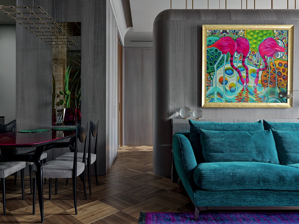 Хозяйка купила квартиру с ремонтом в классическом стиле, пожила в ней несколько месяцев, потом пыталась изменить интерьер своими силами и, наконец, решила довериться Ольге, c которой ее свели общие знакомые. Прежняя планировка была неудачной: слишком много стен и коридоров, поэтому Ольга все полностью перекроила, сделав квартиру максимально открытой. В частности, отказалась от стены между спальней и гостиной, заменив ее перегородкой-коконом, “обнимающим” кровать. Ольга говорит, что не хотела доводить эту конструкцию до потолка, “чтобы сохранить воздух”. Со стороны кухни-столовой спальное место спрятано за деревянным блоком, который дизайнер выстроила вокруг единственной несущей колонны (в ней есть декоративная ниша, а также места для хранения).