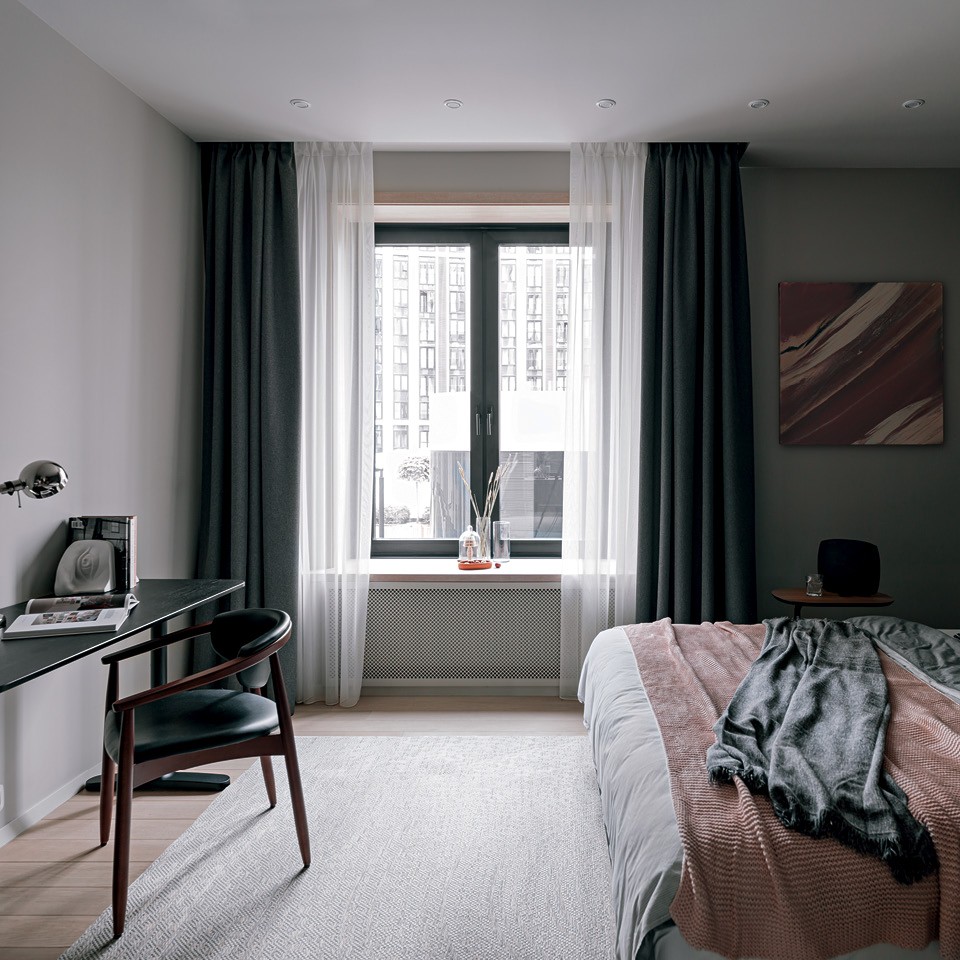 Стилистически супруги тяготели к спокойному и брутальному интерьеру. Однако оформлять маленькое пространство в темных оттенках было бы чересчур, поэтому Ирина сделала акцент на одной стене — за изголовьем кровати. Она придумала конструкцию из гипсокартона, покрытую микробетоном, с выступающими квадратными элементами, в которые встроена подсветка. Получилось одновременно эффектно, брутально и практично. Такую же фактурную отделку имитируют фасады “кухонного” шкафа.