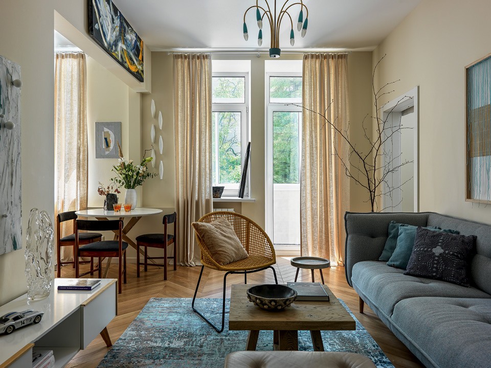 Хозяева никуда не спешили, вникали в детали и тщательно подбирали все предметы. Они даже могли взять вещь на примерку и попробовать с ней пожить, чтобы понять, насколько она им подходит. Так, например, было с картинами, которые Марина писала специально для этого проекта. К старинным элементам здесь можно отнести только паркет “елочка”, который сохранился в двух комнатах, и кресло Swan, переехавшее вместе с заказчиками.