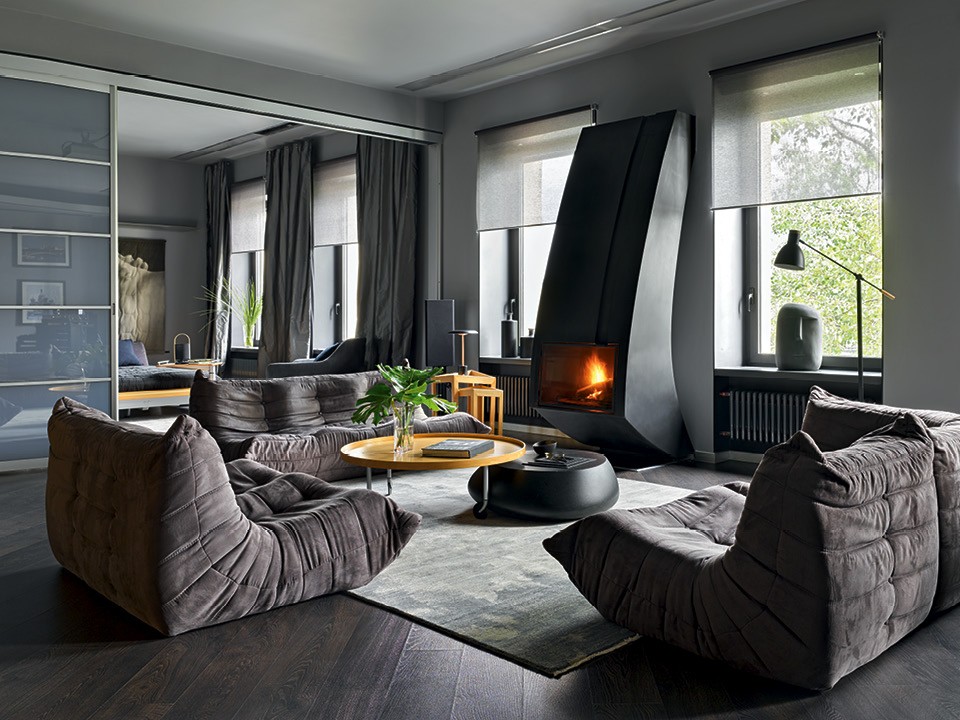 Для Москвы девяностых диваны из пенополиуретана были словно гости из будущего. Как и огромный футуристический камин, напоминающий скалу. Камин, кстати, настоящий, с дровами и дымоходом — ныне крайне редкое явление в городских условиях.