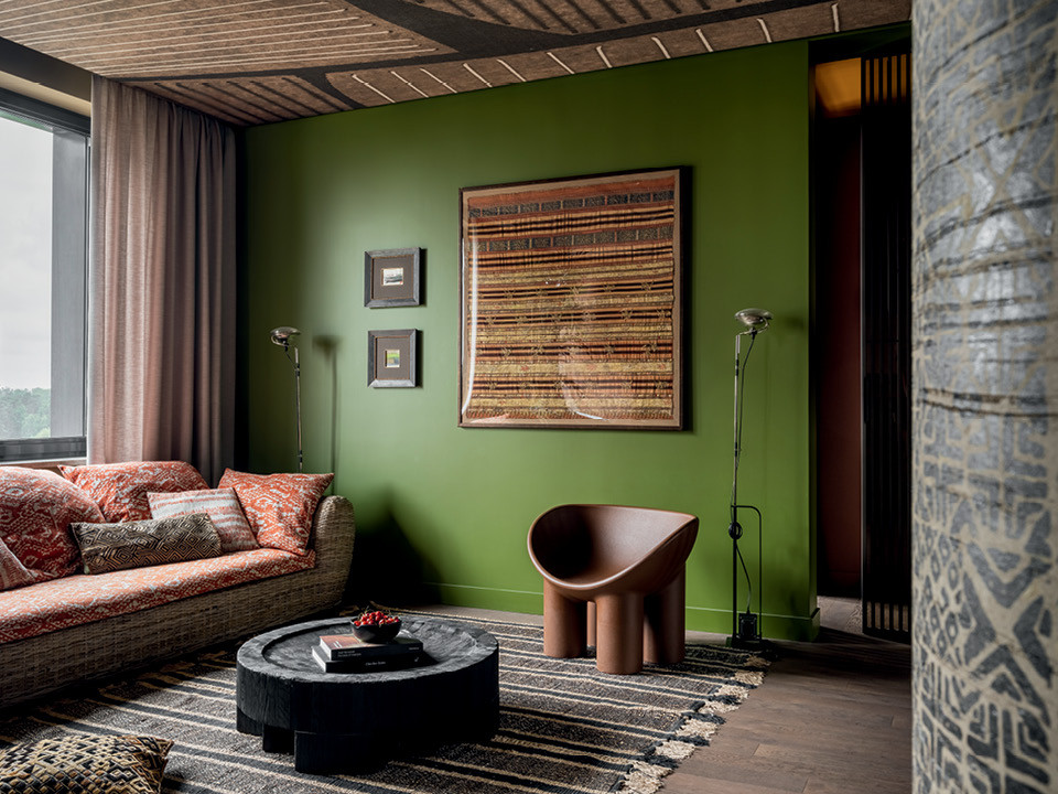 Татьяна Хорошева признается, что тема Африки, ее орнаменты и колористика привлекали ее давно. “Мы мечтали найти кого-то смелого, готового к этой стилистике. Даже думали написать пост в фейсбуке (соцсеть признана в РФ экстремистской и запрещена), что хотим сделать такой интерьер”, — рассказывает она. И тут идеальные заказчики нашлись сами — молодая пара с детьми. Но больше архитекторов заинтересовало происхождение клиентки: ее папа из Танзании, а мама — русско-украинских кровей. “Катрин и Кирилл изначально пришли к нам с примерами ярких интерьеров, но без этники. Когда мы узнали, какие у заказчицы корни, стали деликатно показывать им африканские мотивы и оттенки и интересовались, как они к ним относятся. Им все нравилось!” — продолжает Татьяна.