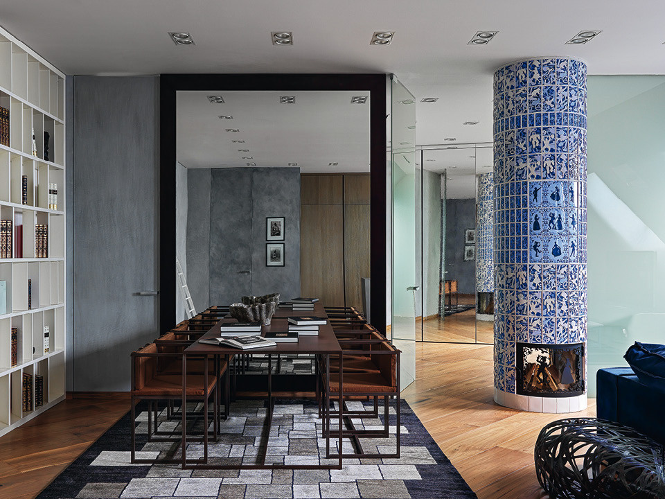 Квартира, которую оформили Кэти Рыжова и Елена Токмачева из бюро “Альба Дизайн Проект”, находится в реконструированном дореволюционном доме в арбатских переулках. Ее хозяйка любит актуальное искусство и современный дизайн, так что интерьер получился на стыке старого и нового, а его символом стала необычная печка. На первый взгляд — довольно типичная круглая голландка, но сюжеты у сине-белых изразцов нетрадиционные, с марширующими девочками, космонавтами и так далее: часть сюжетов придумали авторы проекта, часть позаимствовали у дуэта Studio Job.