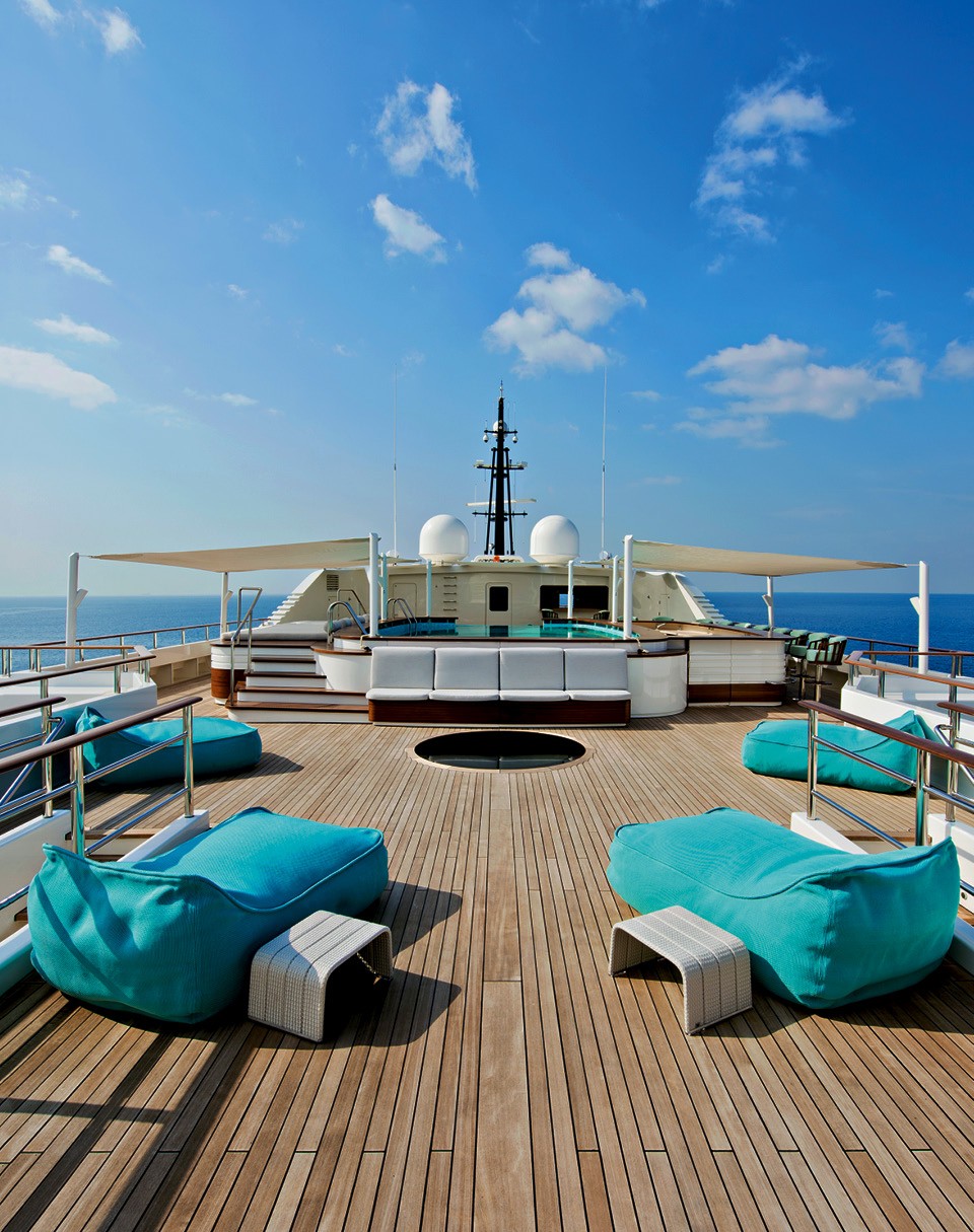 Яхта может принять на борт около полусотни человек, и масштаб работы был сравним с оформлением большого особняка — с поправкой на сложности, обусловленные яхтенной спецификой. Одной из проблем стали многочисленные узкие коридоры, и в решении этой задачи дизайнерам помогли фотографии Версаля британца Роберта Полидори: насмотревшись на снимки дворцовых интерьеров, они сделали транзитные зоны нарочито роскошными (в дело пошли кожа, ткани и деревянные панели), а потому нескучными.