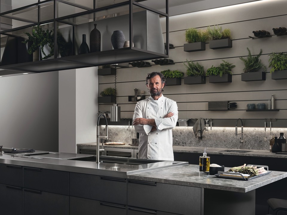 К проектированию новой кухни компания Scavolini решила привлечь не дизайнера, а известного итальянского шеф-повара Карло Кракко (свой ресторан у него не только в Милане, но и в Москве). Получилась модель Mia, которая понравится тем, кто любит много готовить. Из профессиональных атрибутов тут есть вакууматор, лампа для поддержания температуры готовых блюд и мощная вытяжка. Рабочая зона выделена с помощью стали — из нее сделаны плита, раковина, ящик для хранения посуды и посудомоечная машина. Вместо навесных шкафов — специальная панель, на которой можно закрепить держатели для бутылок, кашпо для выращивания зелени или емкости для специй. Mia существует в двух вариантах, для помещений разного размера: с отдельно стоящим островом или укомплектованная в одну линию.