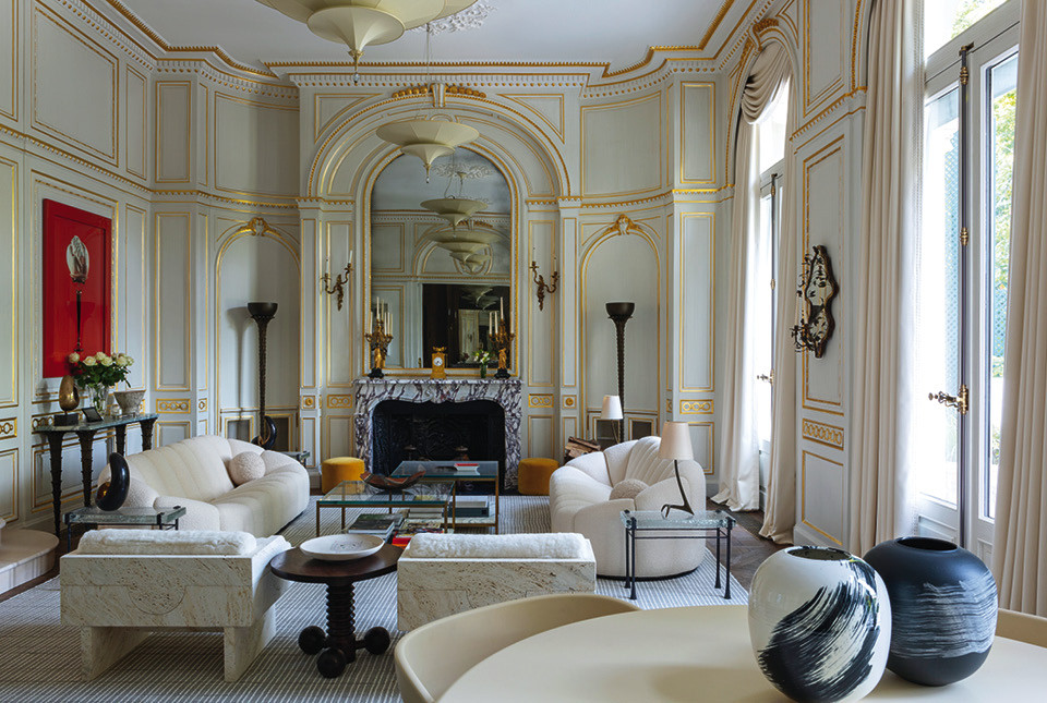 Особняк, построенный Анри Дегланом, автором парижского Гран-Пале, не был в тот момент их основным жилищем — у них дома по всему миру. Видимо, это и позволяло хозяевам долгое время мириться с его несовершенством. Как часто бывает, главной проблемой здания были его прежние владельцы, не слишком бережно обращавшиеся с наследием, так что проект вылился в полную реставрацию. “Я хотел, чтобы все детали были релевантны возрасту дома”, — говорит О’Салливан. Поэтому не обошлось без ремесленников, которых собирали по всей Франции и соседним странам. Например, за полы из антикварного дерева и камня отвечала бельгийская компания Rik Storms, позолоту в главной гостиной восстанавливали мастера из Ateliers Gohard, а всего О’Салливан дирижировал командой из сорока подрядчиков — в этом, как говорит дизайнер, был главный вызов проекта.