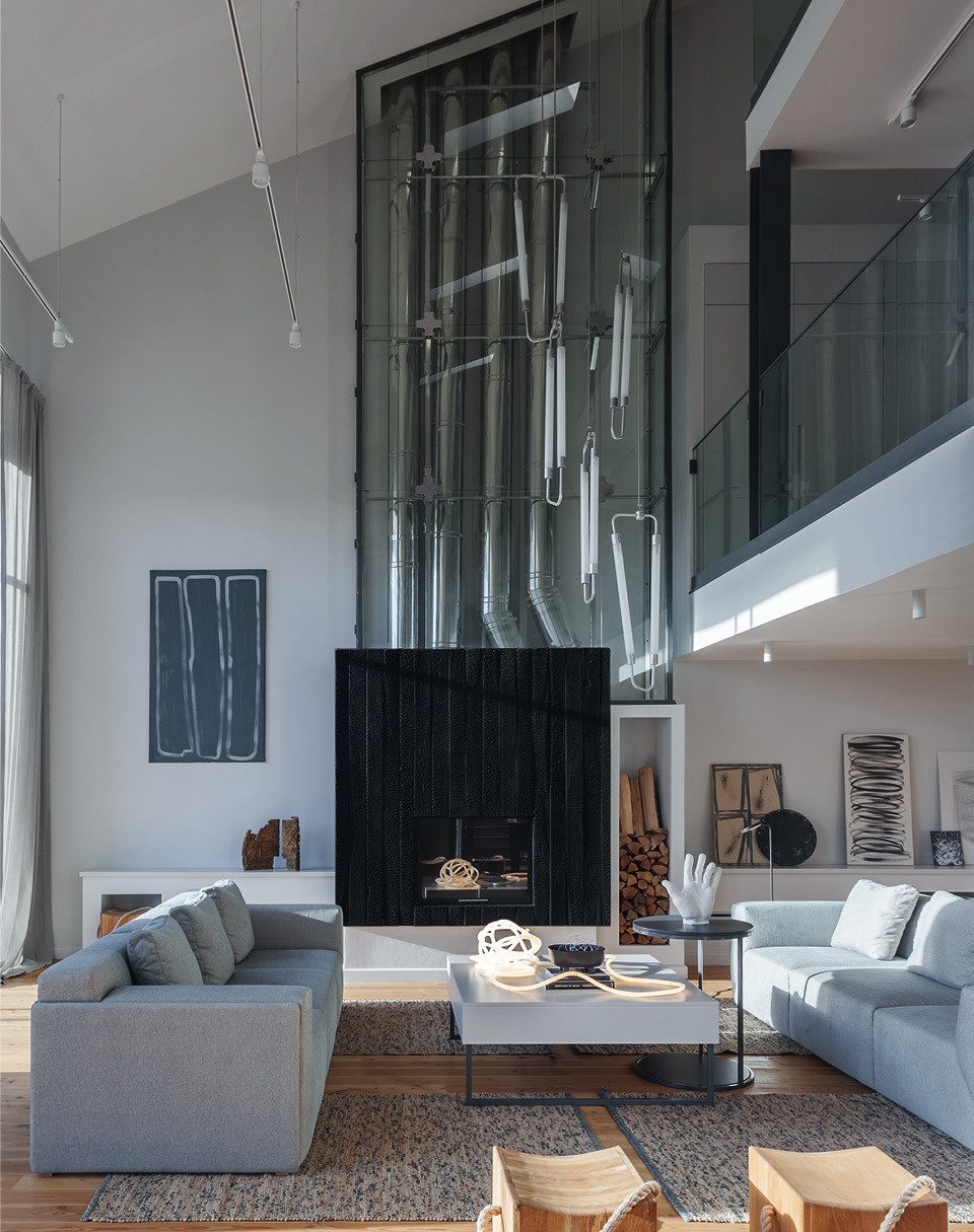 Авторы проекта Елена Иванникова и Сергей Тулецков из студии Honest Design тоже творили, почти ничем себя не ограничивая. Так, например, возник камин, напоминающий орган из водосточных труб, — на самом деле это спрятанные за стеклом дымоходы, тянущиеся с нижних этажей. Обычно их зашивают, а тут не стали. Дизайнеры сделали этот интерьер для молодой женщины, которая почувствовала желание заняться изобразительным искусством и намерена здесь уединяться, как в доме творчества.