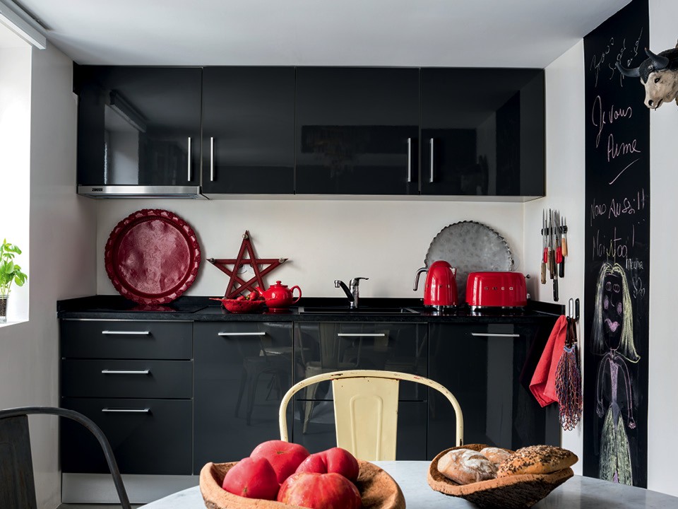 Кухня. Шкафы с глянцевыми фасадами сделаны на заказ по эскизам Терезы Кастро; справа грифельная доска; холодильник и варочная поверхность находятся у противоположной стены.