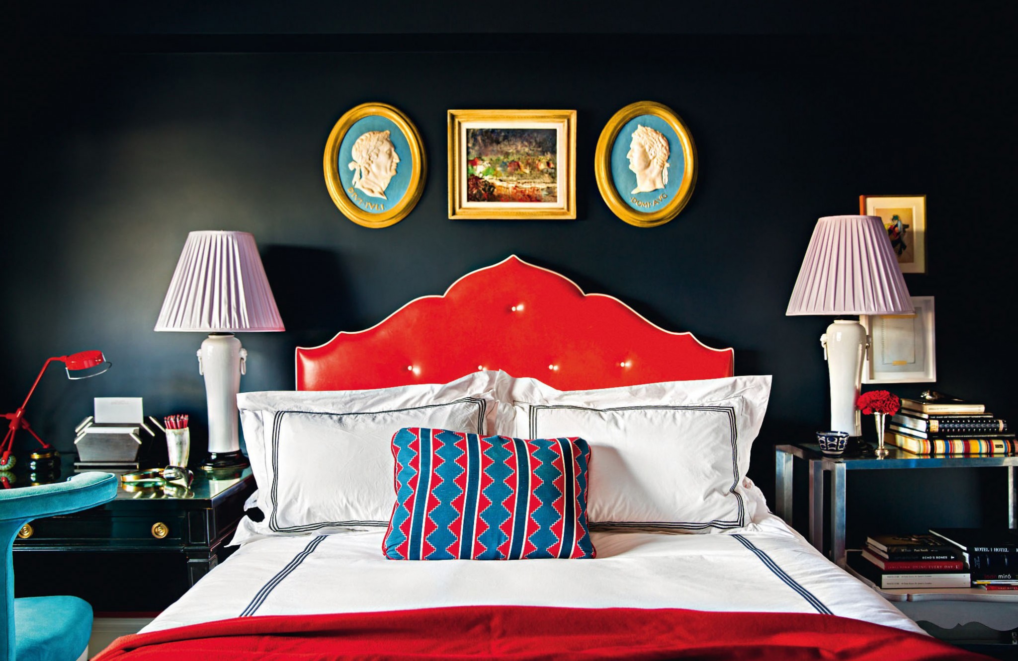 Олсен любит смешивать в своих проектах классическую мебель и яркие краски, а красные акценты — его фирменный прием. Здесь эту роль берет на себя изголовье из красной кожи, которое смотрится особенно сочно на контрасте с темно-синим и голубым. Этот интерьер можно считать эталоном современного американского стиля — укорененного в традиции и одновременно озорного.