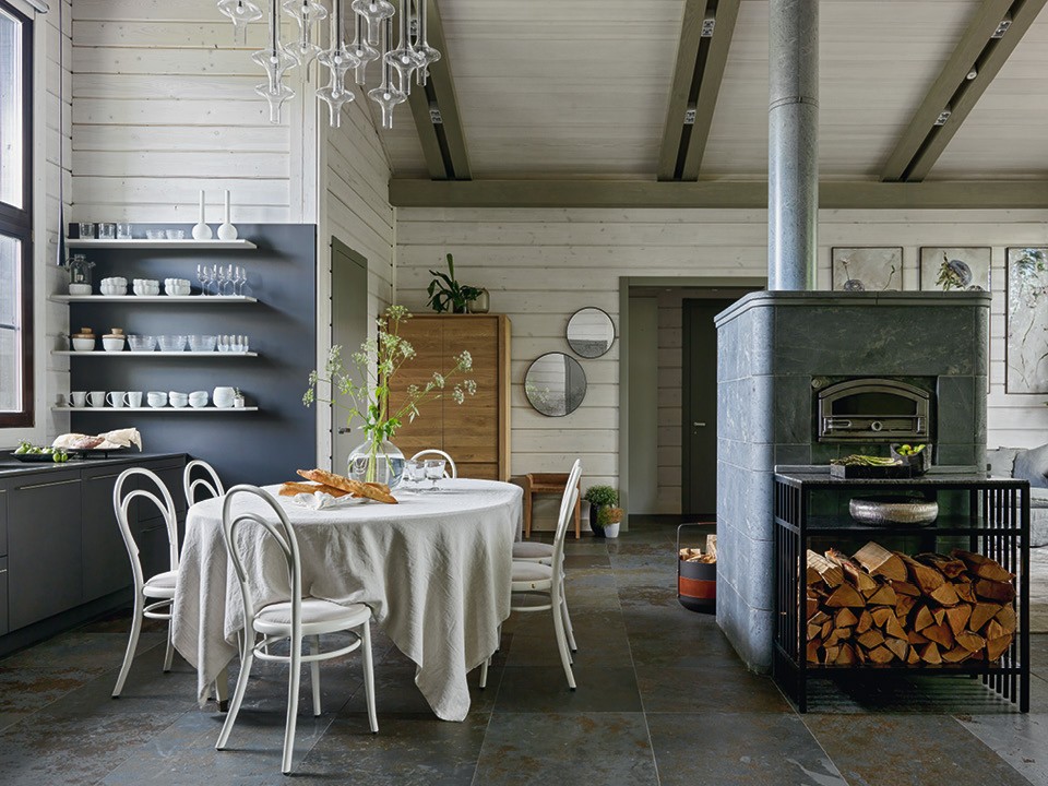 Интерьер этого загородного дома в пригороде Санкт-Петербурга начался с картины французской художницы Лоран Леблан. Масштабный натюрморт, который можно увидеть на одной из стен в гостиной, задал и цветовую гамму, и общее настроение. “Это современная интерпретация традиционной дачи, здесь собираются три поколения одной семьи, — рассказывает Александра Казаковцева, соосновательница студии “MK‑Интерио”. — А внутреннее пространство олицетворяет их энергетику, отношение друг к другу, жизни, природе и вещам”. Сердцем дома стала просторная общая зона с окнами в пол и видом на небольшое озеро. Практически в центре стоит большая чугунная отопительная печь, в которой пекутся пироги для семейных застолий. Ароматы сухих дров и выпечки создают здесь особую атмосферу тепла и уюта.