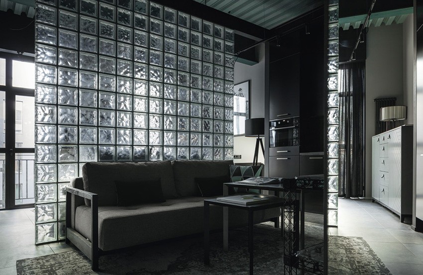Квартира площадью 35 м² в здании бывшей чайной фабрики Клейна. Спальню и кухню-гостиную разделяет перегородка из стеклоблоков.