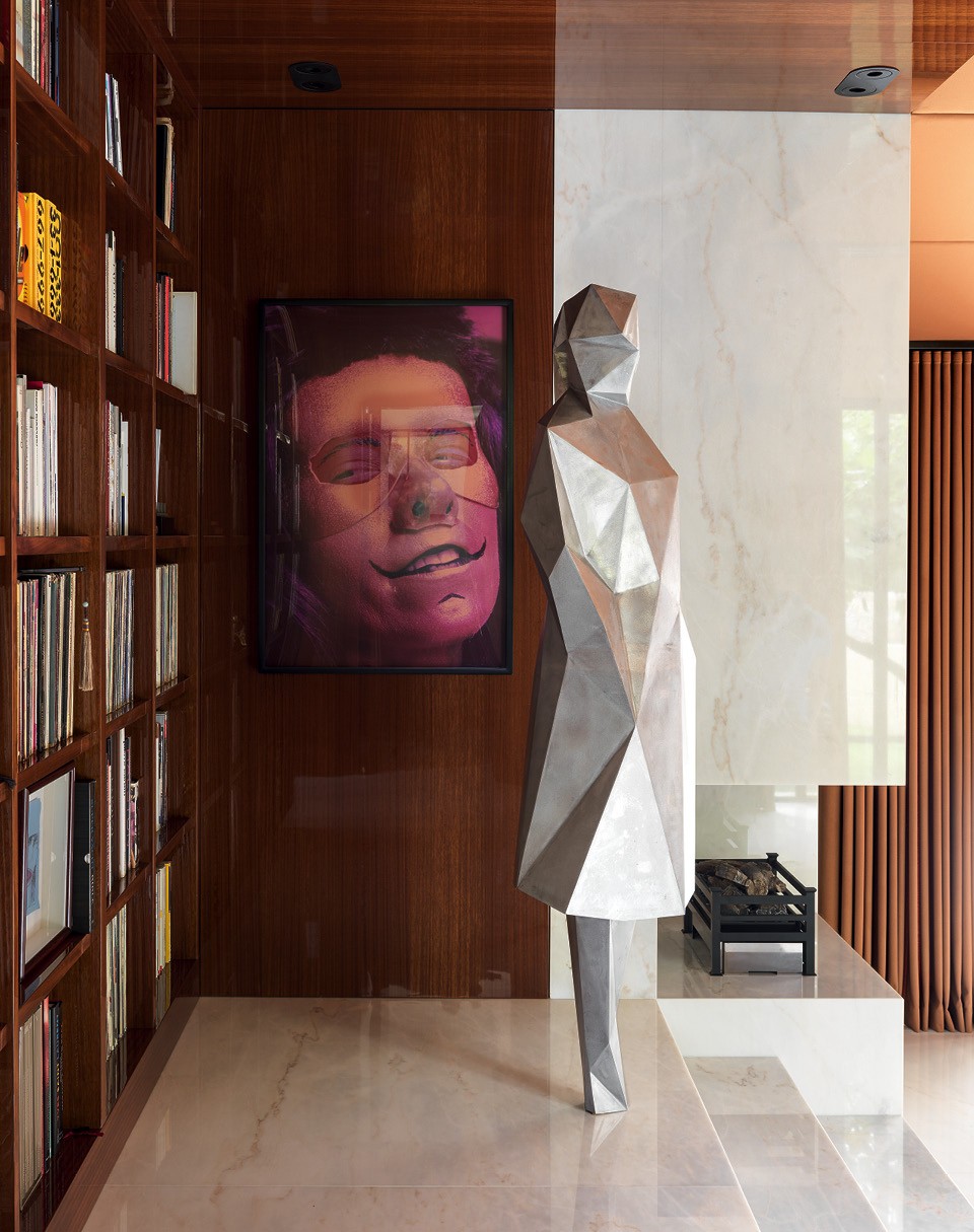 Год ушел на оформление сделки: бывший хозяин умер, и пяти его наследникам надо было договориться о разделе имущества. Еще четыре года ушло на ремонт, который вылился в полную перестройку дома. Новым хозяевам пришлось углубляться на метр с лишним под землю, чтобы поставить здание на нормальный фундамент — без этого сырели стены. В 2011 году во время урагана снесло крышу, что не помешало Беку и Миранде отпраздновать здесь свадьбу, возведя временные декорации из черных стен и красной мебели. “Не то кабаре, не то бордель!” — смеется Миранда. Дизайнеры расширили окна и дверные проемы, сократили число спален до двух, соединили кухню со столовой стеклянным коридором и пристроили над парковкой портик, навеянный архитектурой аэропорта Палм-Спрингс. Бывшие гаражи превратили в столовую и домашний тренажерный зал, где спортинвентарь соседствует со скульптурой Жуана Лоуро и креслом Ханса Вегнера.