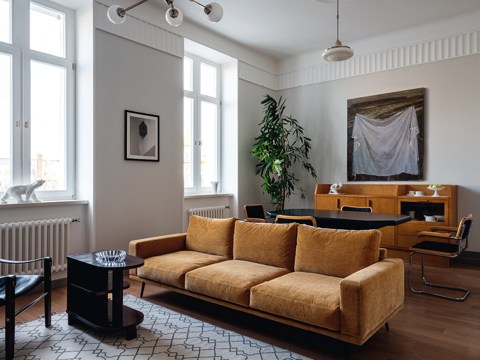 Наши заказчики — врачи, увлеченные путешествиями. Любят горы, Русский Север, архитектуру 1930‑х годов, даже принимали участие в архитектурной поездке на родину конструктивизма, в Екатеринбург. Их новое жилье находится в бывшем доходном доме на Гоголевском бульваре, построенном в 1889 году, а спустя несколько лет перестроенном архитектором Сергеем Флегонтовичем Воскресенским. Это прекрасный старый фонд с потолками высотой 3,6 м и окнами правильных пропорций, из которых открывается вид на здание Наркомата обороны по проекту архитектора Льва Руднева. За планом благоустройства заказчики обратились в бюро “Ветер веет” к архитектору Андрею Суматохину, а наша задача состояла в том, чтобы заложенные им архитектурные решения выстроить в пространстве: разработать архитектурный ордер, определить высоту помещений и проемов, выбрать колористическое решение, спроектировать встроенную мебель и двери, подобрать материалы и мебель и сделать чертежи.