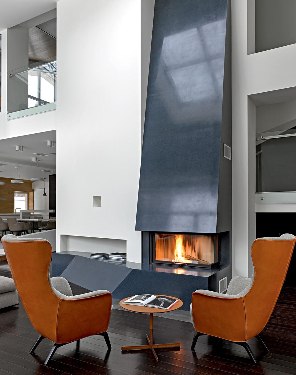По фото не скажешь, но рельеф на участке имеет выраженные перепады, дом расположен на возвышении. Однако геометрия фасадов их компенсирует. Перепад позволил сделать окна в гостевых комнатах, которые вместе с техническими помещениями, спа и кинотеатром спрятаны в цокольном этаже. Фактически все скачки рельефа повторяются в интерьере. Концепцию интерьера Борисенко характеризует словосочетанием “перетекающее пространство”, описывая именно взаимосвязь рельефа и с объемами, и с фасадами, и с интерьерами здания. Принцип “перетекания” нашел отражение и в отделке. “Полы переходят на стены, стены на потолки, при этом все рассечено единой плоскостью, дополнено стеклянными и зеркальными поверхностями, формируя сложно переплетенное развитие пространства”, — поясняет Арсений.