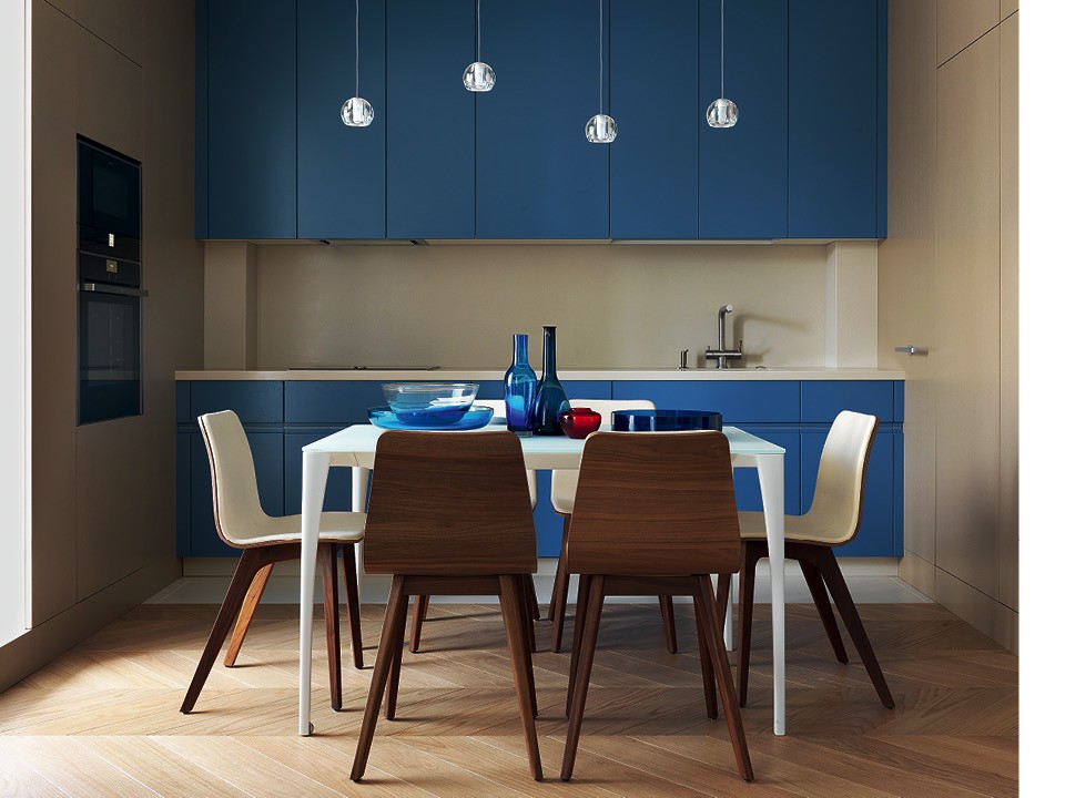Кухня Modulnova с кухонным островом, в котором предусмотрены места для хранения, совмещена со столовой и гостиной. Чтобы разместить гарнитур вдоль стены с окном, пришлось убрать радиатор (он теперь находится за деревянными рейками справа). Вместо него в тонкую столешницу из керлита вмонтировали конвекторы. Хозяйка этой квартиры очень много готовит, поэтому здесь установлена мощная вентиляционная система, чтобы запахи еды не распространялись по квартире.