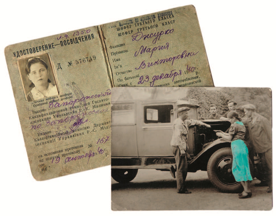 На обратной стороне есть подпись, из нее следует, что снимок сделан 17 июля 1940 года во время практических занятий на Хортице – это самый большой остров на Днепре, расположенный рядом с городом Запорожье. Снят тот момент, когда Мария держит в руках распределитель зажигания и отвечает стоящему слева преподавателю про принцип действия этого механизма. Учебная машина – «полуторка» ГАЗ-АА, самый распространенный советский грузовик тех лет. Но кузов – необычный, сделанный по типу автобуса, чтобы возить сразу несколько обучающихся. Мария среди них – единственная девушка, такая миниатюрная и такая далекая от тогдашнего скульптурного идеала с веслом, что вообразить ее за рулем полуторки довольно сложно. Да и туфельки с ремешком не очень подходят к грубым педалям грузовика, как и чулки вместо модных тогда белых носочков.