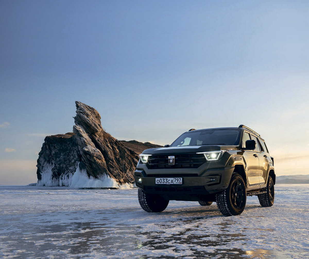 Вне машины, конечно же, безопаснее, но вылезать не хочется. Внутри – невиданный простор, о чем не подумаешь, стоя снаружи, но об этом позже. Красная благородная наппа, доступная в топ-комплектации Premium. Водительское кресло регулируется по восьми направлениям, а еще в нем есть неплохой массаж. Обилие приятного декора из полированного алюминия. Над стеклянной крышей – голубое байкальское небо. Круглый руль, что сегодня большая редкость. Позади него – цветной проекционный дисплей с приятными шрифтами, что, кстати, касается и в целом всех изображений на двух экранах. Достаточное количество аналоговых органов управления – это и вовсе по нынешним временам воспринимается как роскошь. Безупречно работает климатическая система, а снаружи 20 градусов мороза. Но вылезать надо. В том числе для того, чтобы посмотреть, как гармонично смотрится Tank 400 на фоне байкальских скал – та же надменная угловатая сила. Но в случае с автомобилем эта эстетика продиктована еще и функционалом: короткие свесы, высокий клиренс, огромное пространство в арках над колесами, сообщающее о возможностях хода подвесок, – все это говорило о серьезности намерений автомобиля. В чем, собственно, была возможность убедиться на трассе, петлявшей по сопкам в окрестностях поселка Хужир на Ольхоне. Отчаянным бездорожьем ее назвать язык не повернется – просто колея с высокими буграми и глубокими ямами. Tank 400 все это преодолел играючи, ничего не зацепив днищем, что, впрочем, тоже не было бы бедой, потому что все уязви