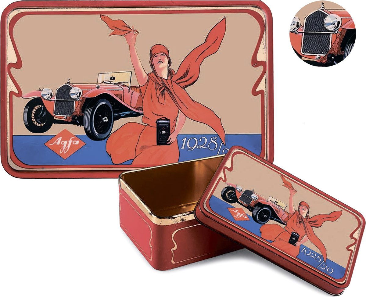 Наверное, с этой жестяной коробочкой произошла такая же история, хотя, судя по названию, изначально ничего вкусного внутри нее не было. На крышке нарисована девушка с фотоаппаратом в руке на фоне гоночного автомобиля, в котором узнается Alfa Romeo 6C 1750. Но не автомобиль тут главное, ведь на крышке есть еще и логотип немецкой фирмы Agfa, выпускавшей фотоаппараты и фотопленку. Вряд ли коробочка использовалась как упаковка для фотоаппарата, а вот пленку в ней вполне могли продавать. Как раз поместится несколько рулончиков среднего формата для ручных камер, подобных той, что у девушки в красном платье.