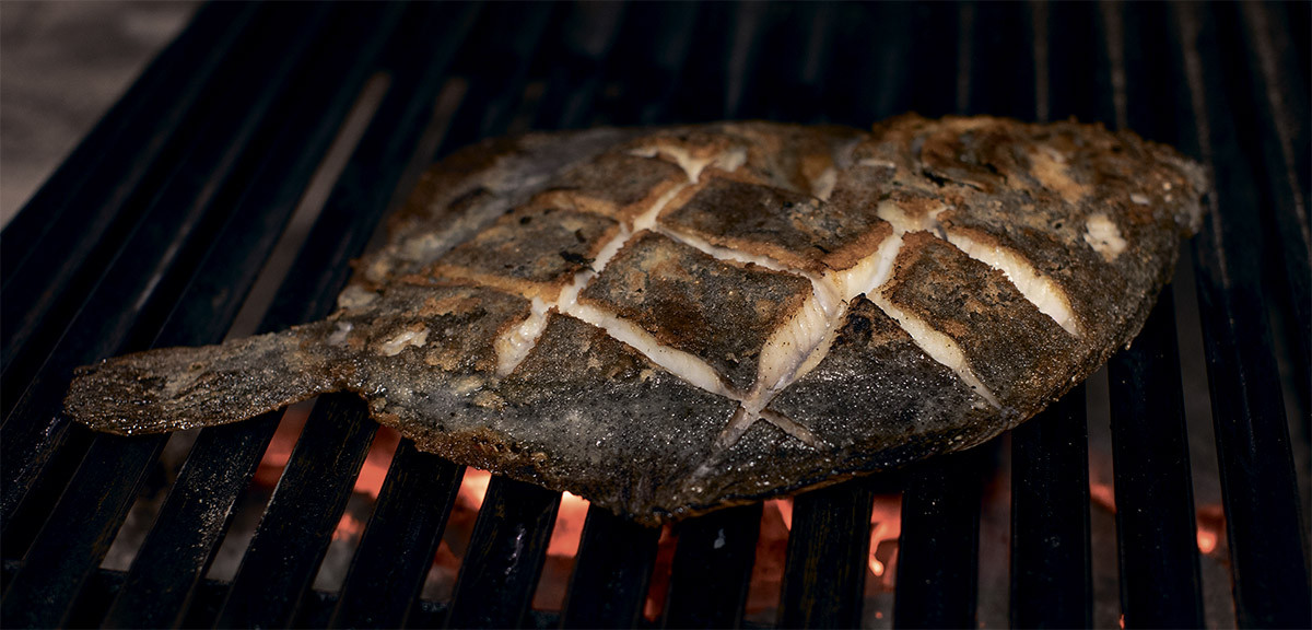 Рассказ о нашем локальном продукте хочу начать с того, что лежит на прилавках в магазинах и чем пользуются обычные домохозяйки. В первую очередь это северная треска и минтай, цены на которые в какой-то момент резко взлетели, что вывело эти два вида рыбы на новый уровень. Поскольку часто мы получаем продукты не самого хорошего качества, важно придумать оригинальную технологию для их дефростации и приготовления. Я использую преимущественно свежемороженую северную треску с минимальным количеством глазури, которая приходит тушкой, и дефростирую ее в так называемом растворе от обезвоживания, чтобы получить натуральный рыбный желатин. Раствор выглядит так: кипяченая вода, соль, сахар. В холодный раствор помещается тушка трески и выдерживается 8 часов в холодильной камере при температуре 7–12 °С. Для получения желатина тушку нужно нарезать на несколько кусков, уложить в подсолнечное или оливковое масло, довести до температуры 70–80 °С и выдержать 2–3 часа. Если будете использовать су-вид, как это делаем мы, увидите, как на дне вакуумного пакета начинает скапливаться белая жидкость — это и есть тот самый рыбный желатин, самый что ни на есть натуральный. Если готовите на сковороде, нужно все время помешивать, чтобы рыба не прилипала. Эта технология позаимствована у испанцев для приготовления одного из самых вкусных блюд нашего меню в «КрабахКутабах» — трески под соусом пиль-пиль. Мы доводим соус до мегагустой консистенции, охлаждаем, добавляем специи и подаем с запеченной кукурузой и