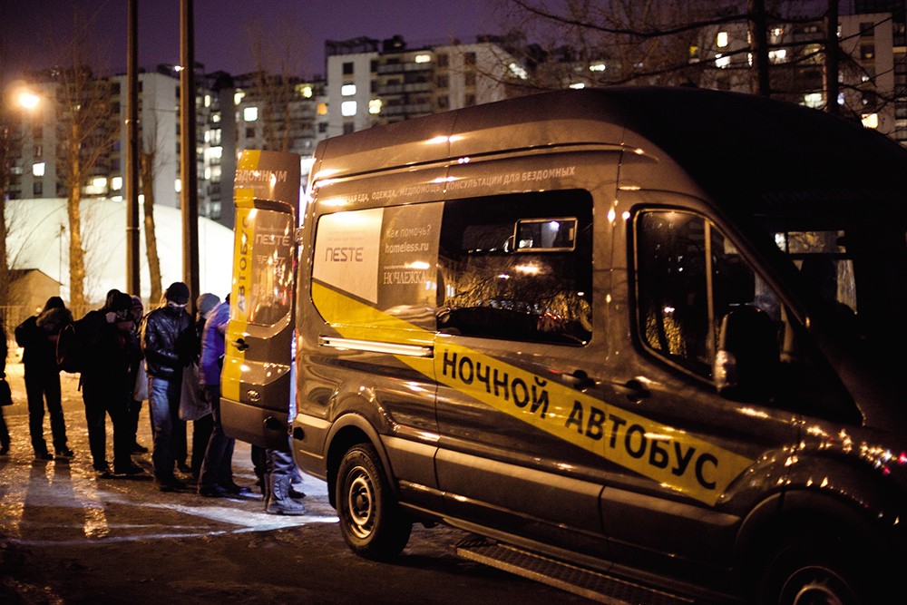 — Мы обмолвились, что у нас есть идея создать автобус с горячим питанием для бездомных по подобию гамбургского Mitternachtbus, — рассказывает Андрей Чапаев, руководитель гуманитарных проектов благотворительной организации «Ночлежка». — Там была пожилая семейная пара, которая не только нас выслушала, но и помогла. По возвращении домой эти люди отмечали годовщину свадьбы и попросили родных и друзей не дарить им очередной ковер или подсвечник, а сделать пожертвования на наш проект. Так у нас первый «Ночной автобус» и появился. В Гамбурге в таком автобусе поят чаем и предлагают выпечку, поскольку там вопрос пропитания бездомных стоит все же не так остро, а мы сразу ввели в меню порцию горячей еды, хлеб и чай.