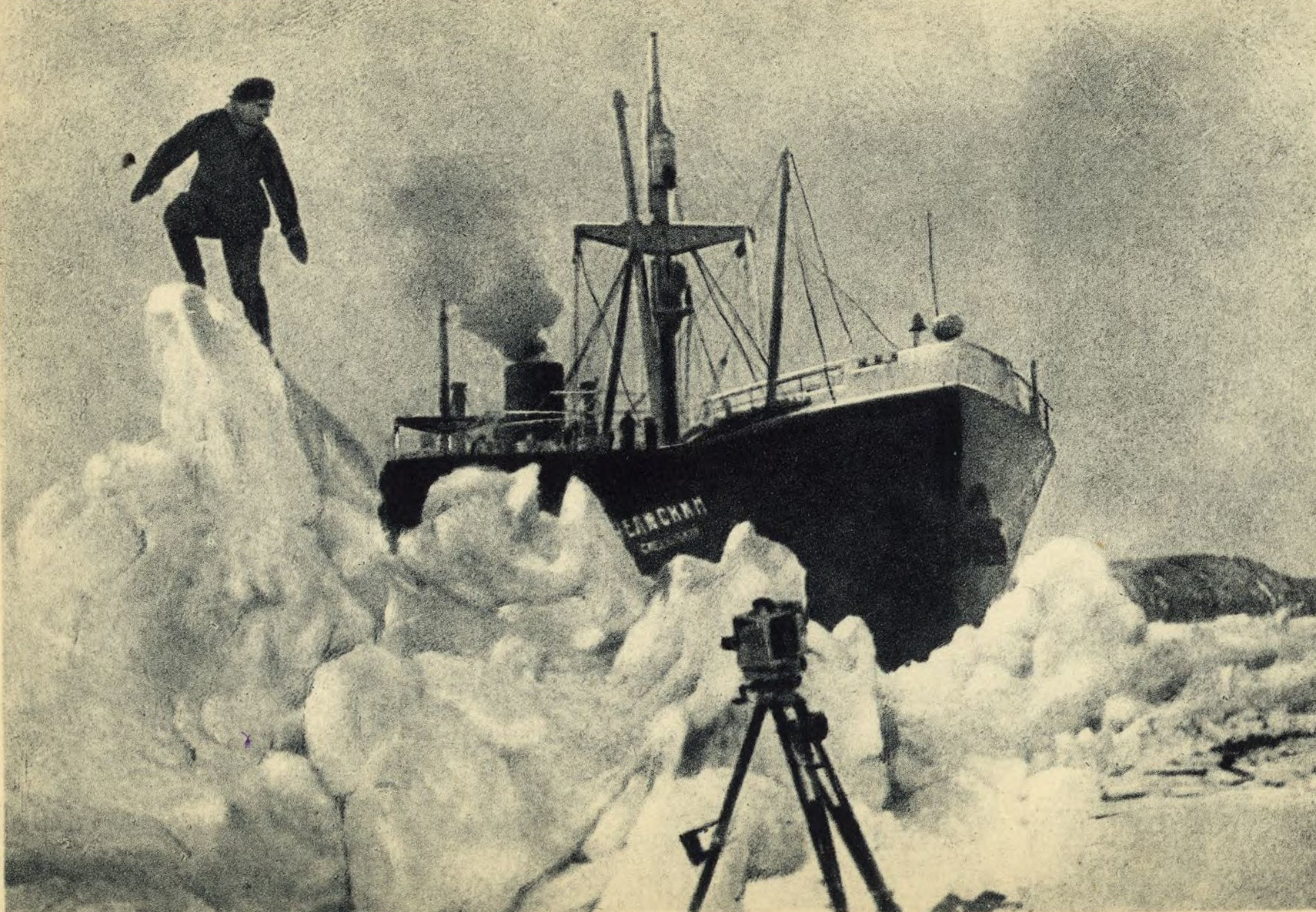 Агония судна длилась недолго. Через проломленные льдом борта черная морская вода заливала трюм, отяжелевший нос неудержимо тянуло ко дну — палуба накренилась, рывком вздернулась корма, обнажив беспомощный винт. И словно последний вздох, столб пара и сажи взметнулся над поверженным кораблем, и он тотчас ушел под воду. Людей, оказавшихся после гибели «Челюскина» на льду Чукотского моря, обступили пурга и стремительно надвигавшаяся ночь…