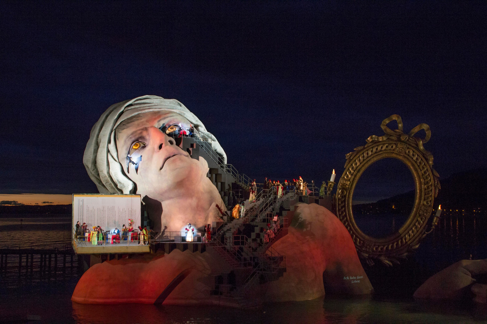 Плавучая оперная сцена Брегенцкого фестиваля стоит на сваях в Боденском озере. Во время спектаклей озеро используется как продолжение сценического пространства. Например, в постановке оперы Умберто Джордано «Андре Шенье» водоем «играл» роль ванны, в которой был убит Марат. Главной же декорацией к спектаклю стал гигантский бюст якобинца (высотой 24 метра, весом 60 тонн).