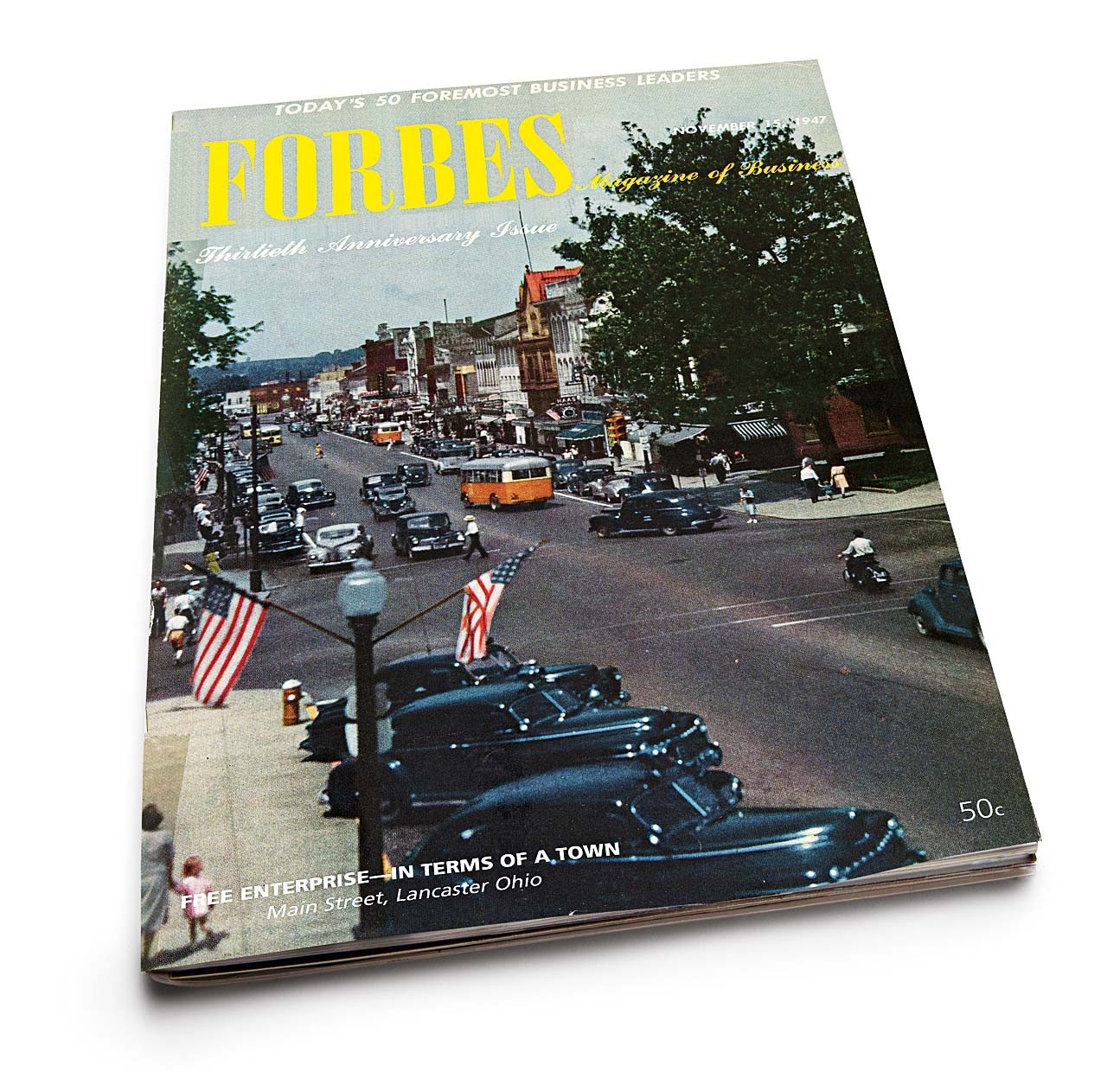 После войны в США начали расти пригороды. В 1947 году на обложку юбилейного, посвященного 30-летию Forbes, номера попал Ланкастер — «прогрессивный американский город» (24 000 человек) в пригороде столицы штата Огайо, в котором сочетаются преимущества сельской и городской жизни. Ветераны обеспечили рабочей силой местные предприятия. Героем номера стал один из них, загорелый и рослый Джек Фишер, рабочий на заводе стеклоизделий Anchor Hocking — крупнейшем предприятии города.
