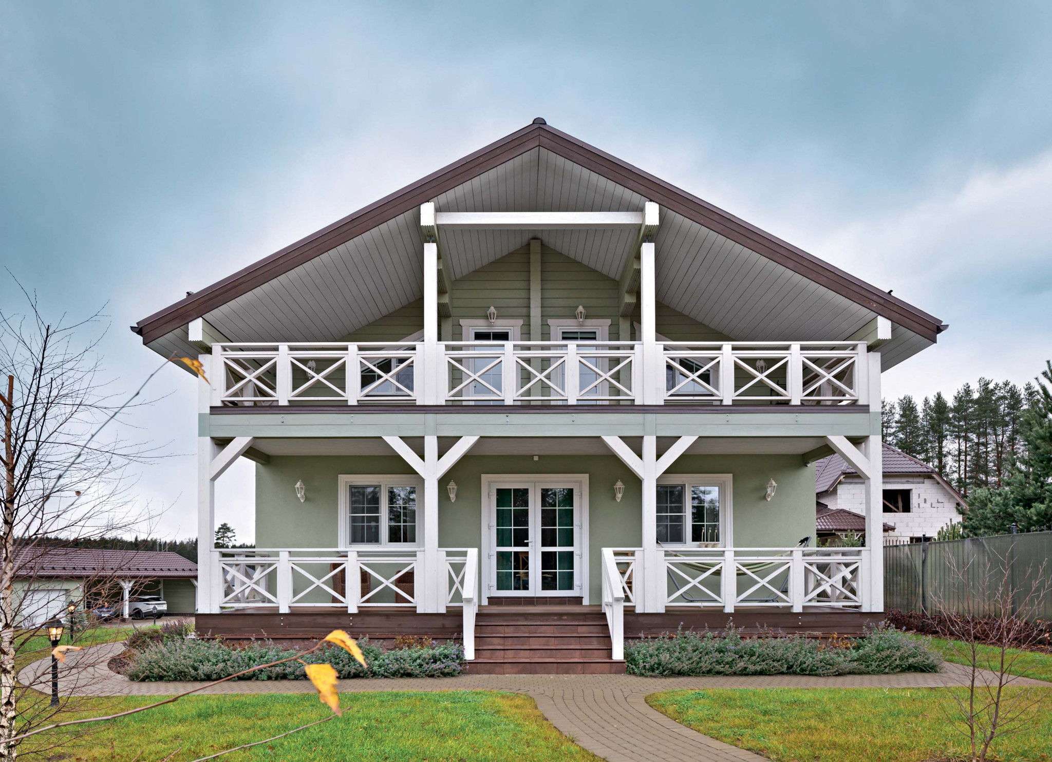 Проект в стиле шале — с террасой и балконами под крышей, с мансардой и камином — сразу понравился заказчикам. Благодаря поездкам на горнолыжные курорты Европы такое архитектурное решение вызывало у них приятные ассоциации с отлично проведённым временем. Чтобы органично вписать «горную хижину» в среднерусский пейзаж, фасады коттеджа выкрасили в цвет зелёного яблока.