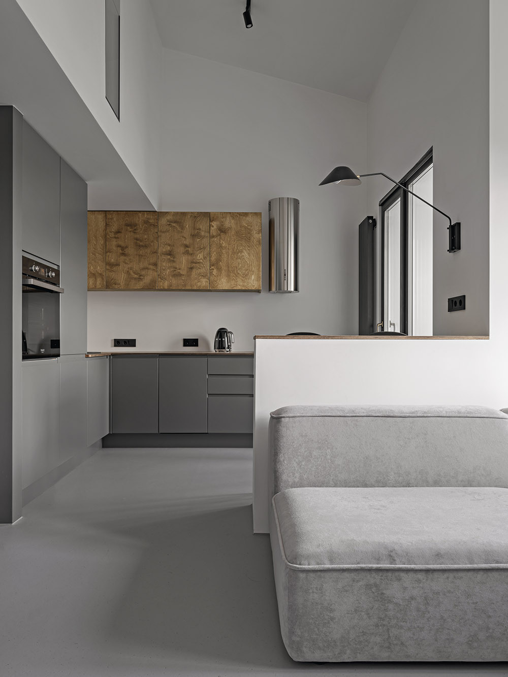 Молодая пара с прогрессивными взглядами на жизнь приобрела в ЖК «Театральный парк» в подмосковном Королёве нестандартную квартиру с намерением сделать двухуровневое жильё в стиле минимализм. Поскольку заказчики имеют отношение к миру моды и искусства, эстетике будущего пространства отводились лидирующие позиции. Архитектора искали соответствующего — способного к концептуальным решениям. И когда поняли, что нашли, дали карт-бланш, но в рамках отведённого бюджета. Набор помещений требовался стандартный: на первом уровне кухня-гостиная, санузел, на втором — спальня с гардеробной. Предпочтение отдавалось натуральным материалам.