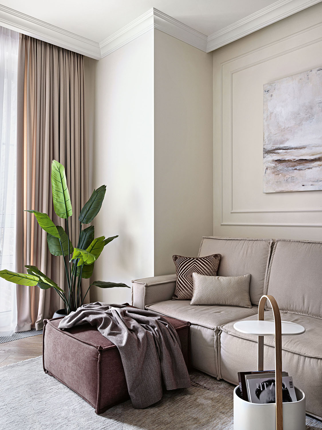 Хозяева квартиры много времени проводят в командировках. Их работа — проектирование и управление строительством заводов газохимической отрасли — сложная и насыщенная, вынуждающая подолгу жить вне дома и тосковать по домашнему очагу. Для создания собственного оазиса уюта — пространства для двоих, полного гармонии, покоя и умиротворения, — заказчица пригласила дизайнера
